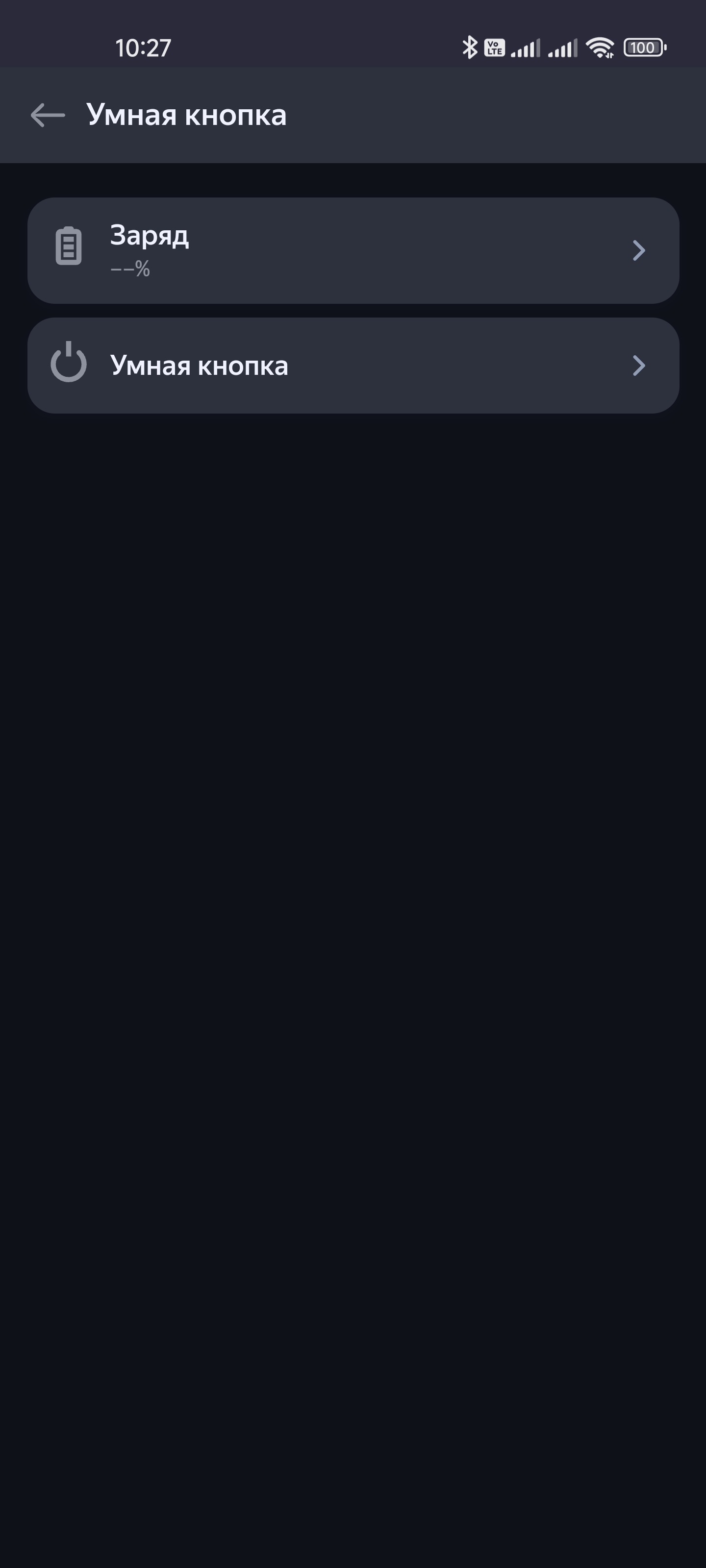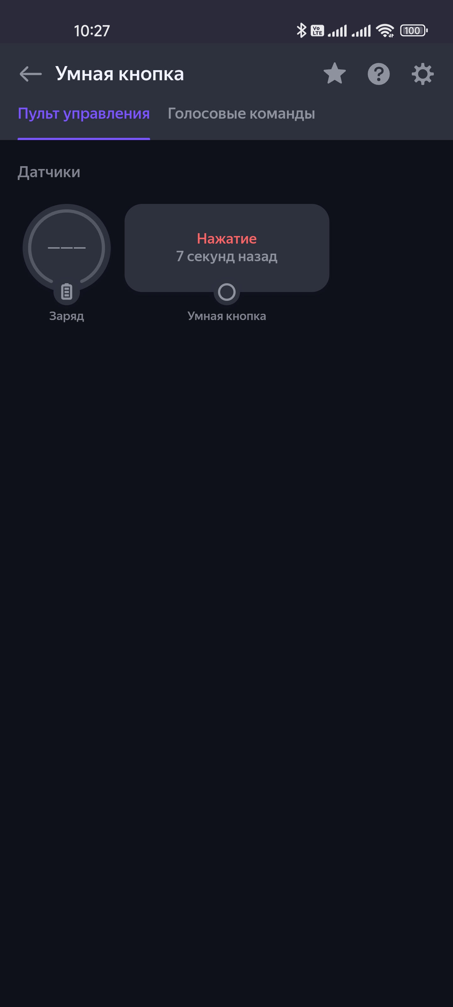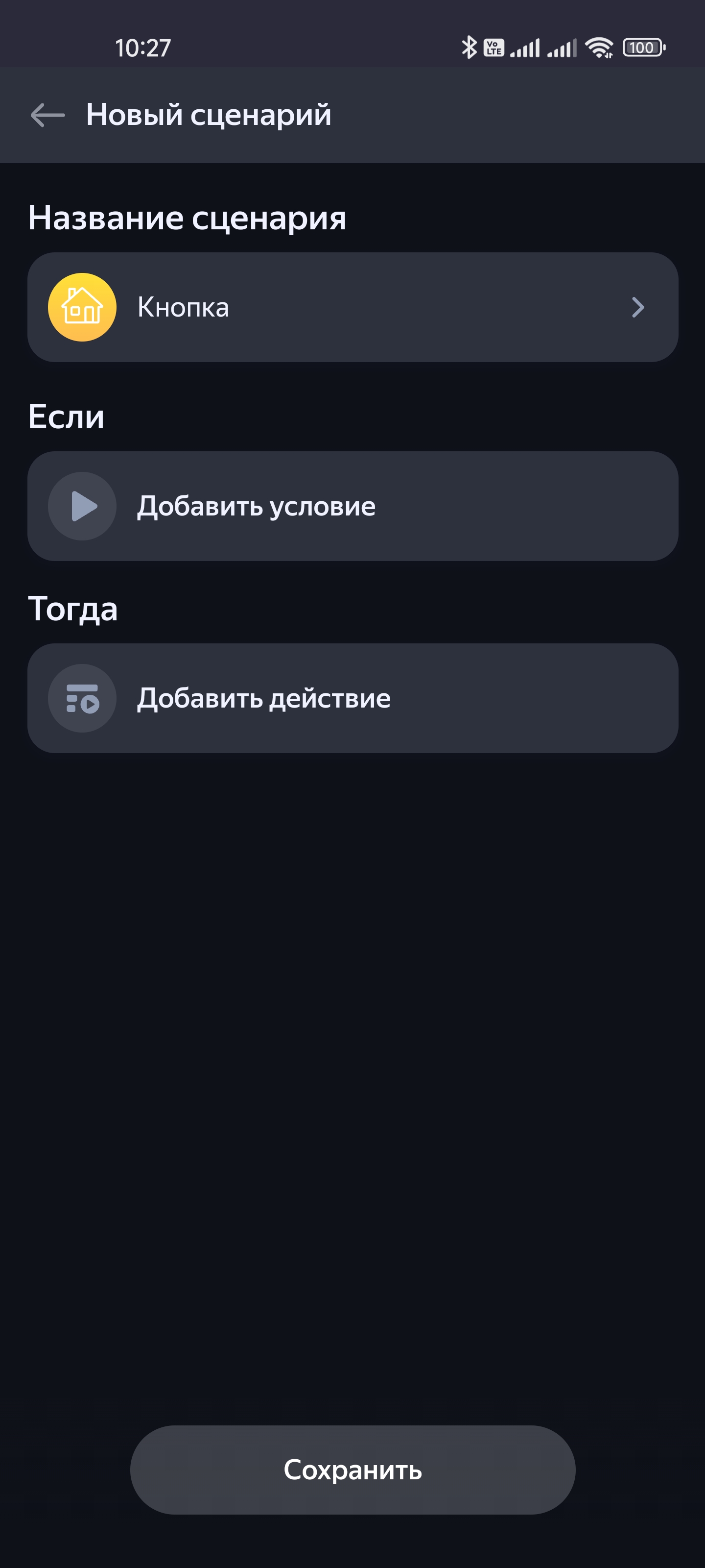 Про «умную» кнопку многого не скажешь. Это просто кнопка. На ее странице можно увидеть уровень заряда и время последнего срабатывания. А далее вновь добавляем сценарий.