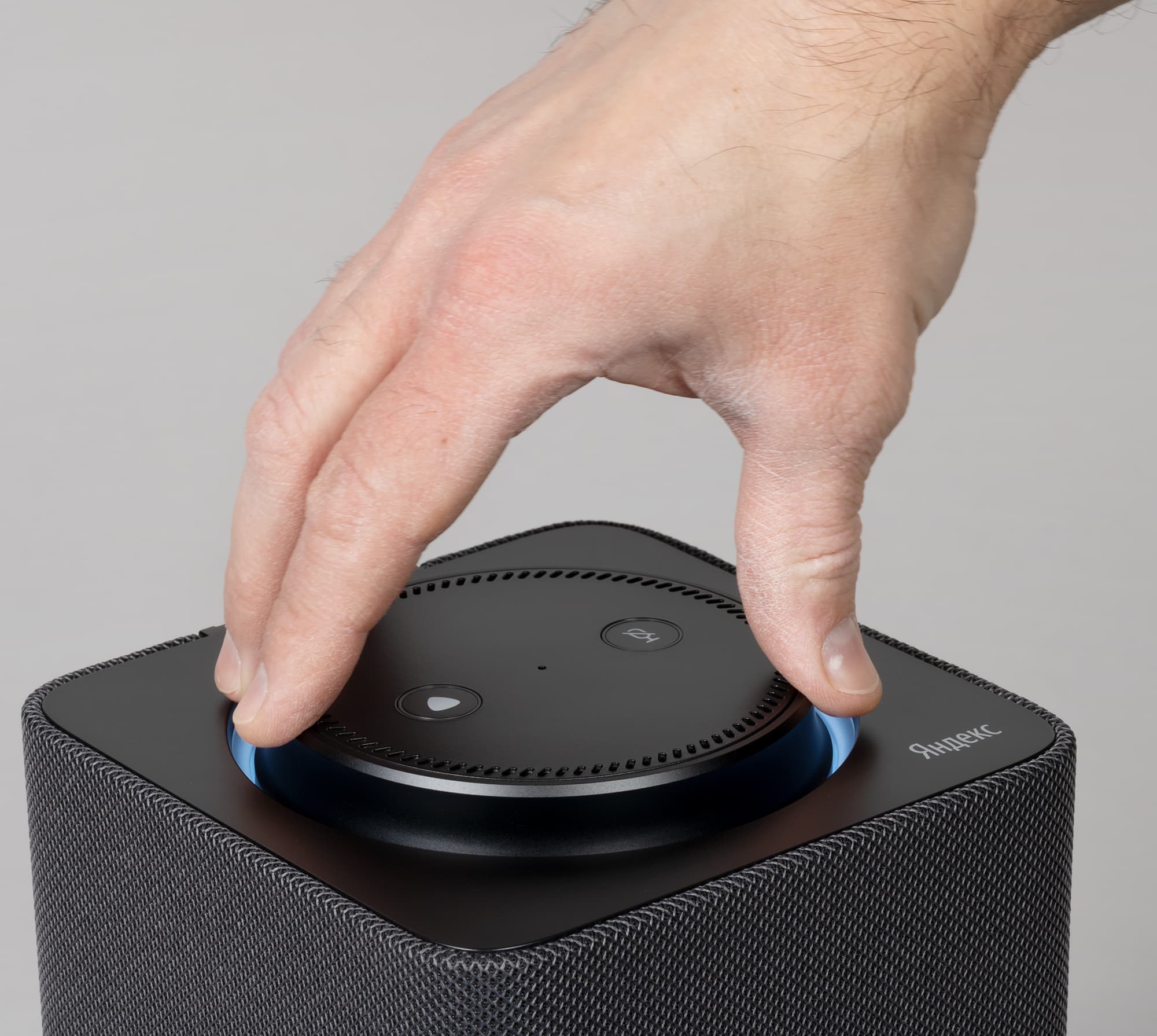 На верхней поверхности регулятора находятся две кнопки: одна отвечает за активацию голосового помощника, другая — за отключение микрофона. О том, что микрофон неактивен, сигнализирует красная подсветка вокруг клавиши.