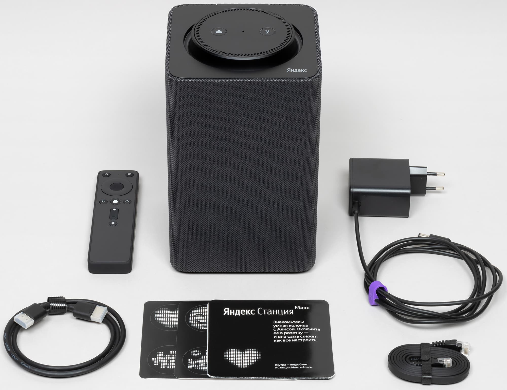 В комплект входят сама колонка, пульт дистанционного управления, блок питания, плоский Ethernet-кабель длиной 1 метр, документация и HDMI-кабель. Последний коротковат — всего 1 метр, колонку придется размещать возле самого телевизора. Все кабели стянуты многоразовыми хомутами — пустячок, а приятно.