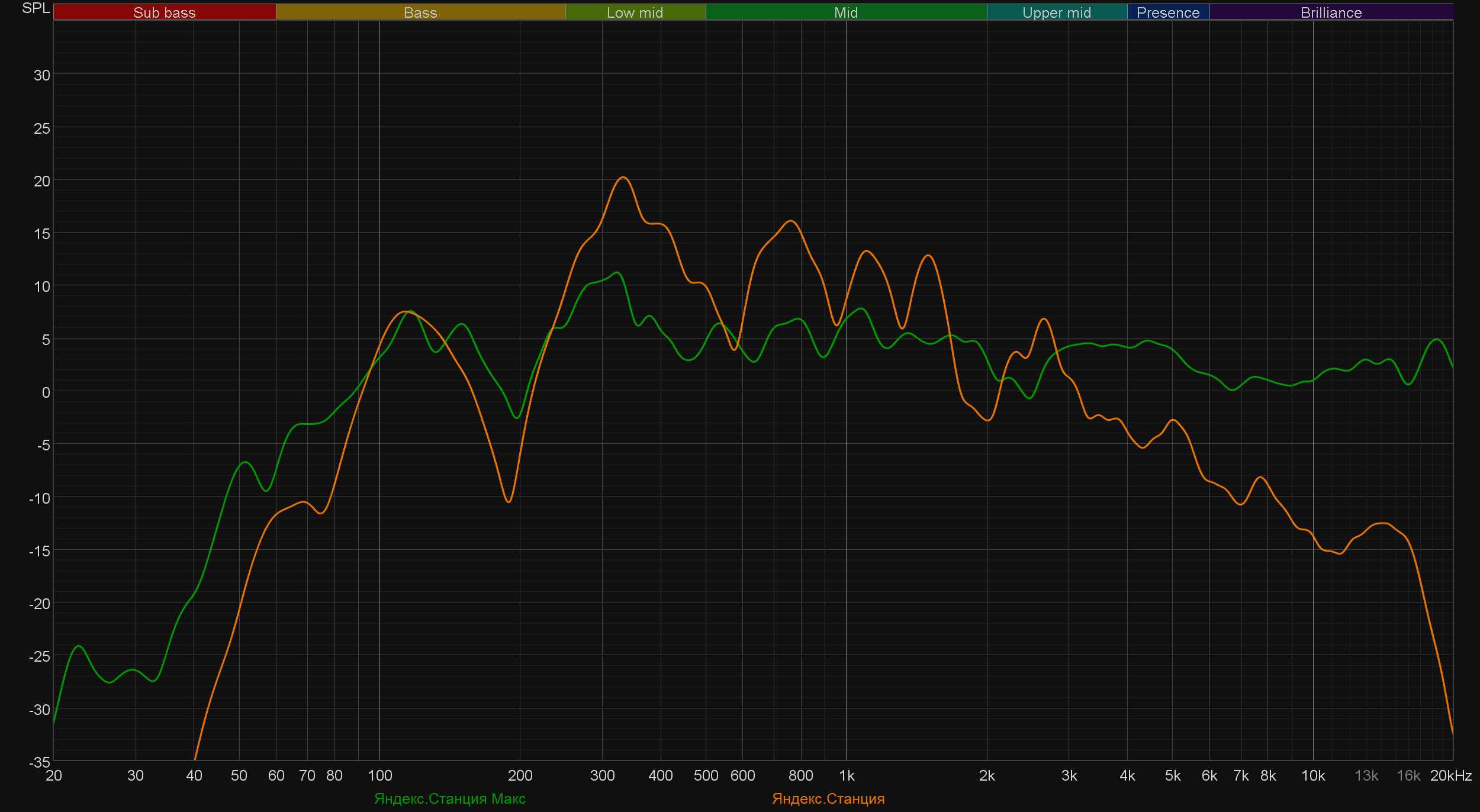 У нее есть те же провалы и те же пики, только выражены они ощутимо сильнее — отсюда и довольно спорная подача низкочастотного диапазона. Плюс, конечно, далеко не такая ровная середина и однозначно меньшие способности к воспроизведению ВЧ-диапазона. В общем, по картинке выше довольно наглядно видно, что в плане качества звука новый флагман ушел далеко вперед. Сравним его еще с парой «умных колонок» с Алисой, похожих по габаритам.
