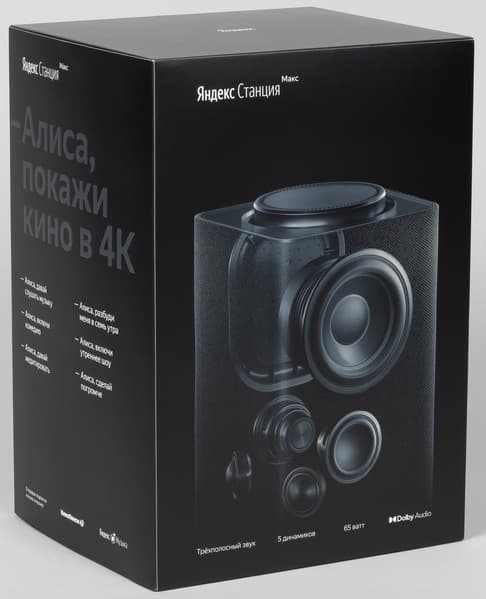 Поставляется «Яндекс.Станция Макс» в крупной картонной коробке со съемной крышкой, на «суперобложку» которой нанесены изображения устройства и его краткие характеристики. Дизайн выполнен в темных тонах, выглядит очень солидно — все как заведено в премиальном сегменте.