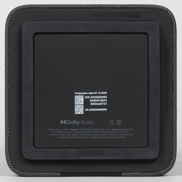 На дно нанесена краткая информация об устройстве, в частности — иконка, сигнализирующая о поддержке Dolby Audio. Правда смысла в этом пока немного, но есть определенные надежды на будущее — об этом еще поговорим ниже.