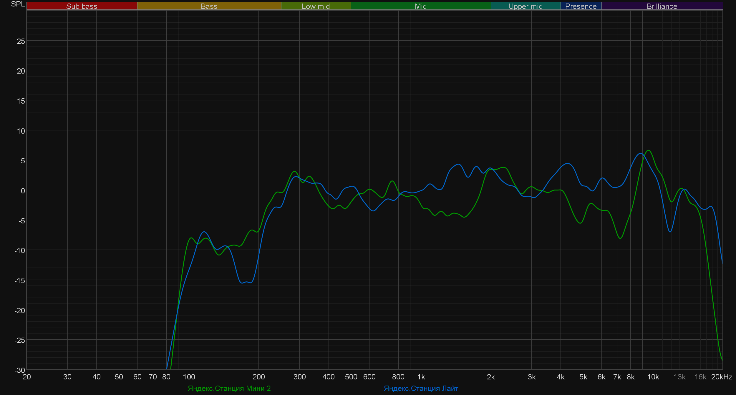 Ну и ради интереса сравним график АЧХ героини сегодняшнего обзора с еще несколькими «умными колонками» сопоставимых габаритов. Как несложно заметить, звучат они все довольно своеобразно и более-менее сравнимо. Разве что Prestigio SmartVoice совсем уж выбилась из общей массы… Но и называется она SmartVoice, а не SmartMusic.