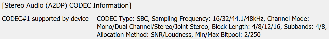 Кодек вновь один — базовый SBC, для маленькой колонки с пластиковым корпусом его возможностей однозначно хватит с запасом. При этом максимум параметра Bitpool у него выставлен на уровне 250, тогда как рекомендованный профиль High Quality подразумевает значение 51. Так что отработает он на максимуме своих возможностей.