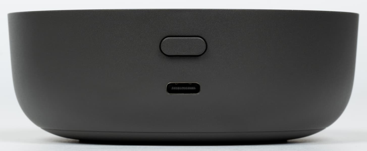 В задней части корпуса находятся порт USB Type‑C для питания и механическая кнопка отключения микрофонов. Сверху, как обычно, расположены сенсорные клавиши и отверстия для микрофонов. Причем отверстий — четыре, а микрофонов — три: четвертое предназначено для датчика освещенности, который помогает регулировать яркость дисплея и подсветки.