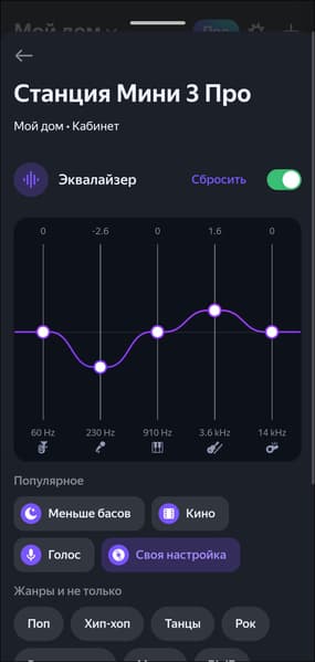 Настройки у «Станции Мини 3 Про» остались такими же, как у базовой версии. Звук можно гибко подстроить, но только при воспроизведении через «Яндекс Музыку» — при Bluetooth-подключении все параметры придется менять на источнике. Тоновый баланс изменяется с помощью графического эквалайзера с пятью полосами: немного, но для устройства такого класса — вполне достаточно. Есть набор из десятка готовых пресетов и возможность сохранить собственный вариант. Также поддерживается кроссфейд — треки могут плавно перетекать один в другой, создавая более цельное звучание.