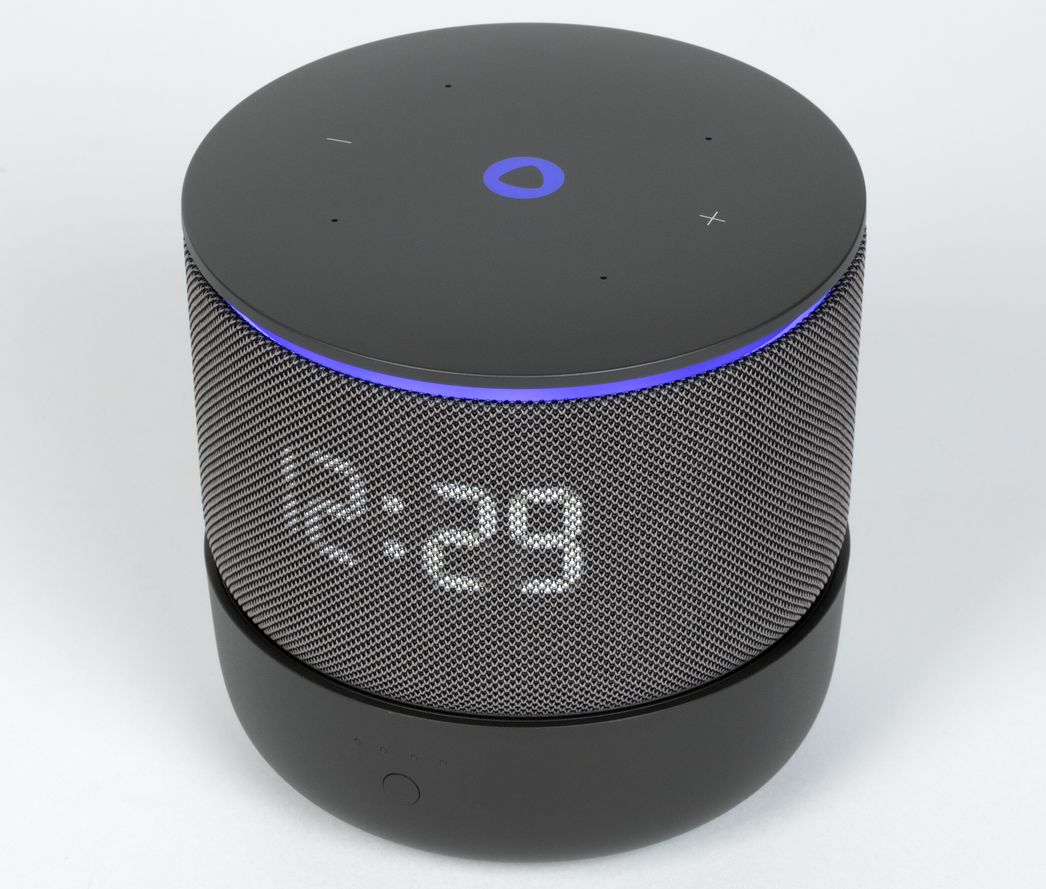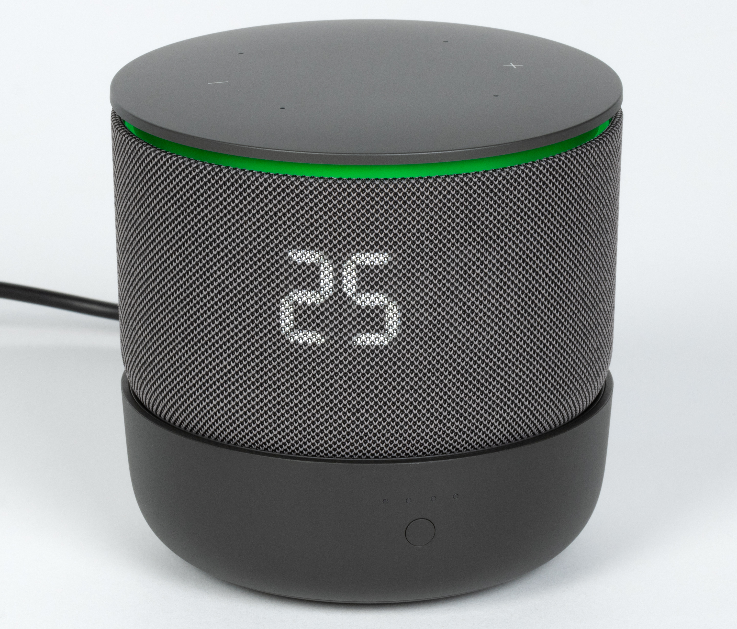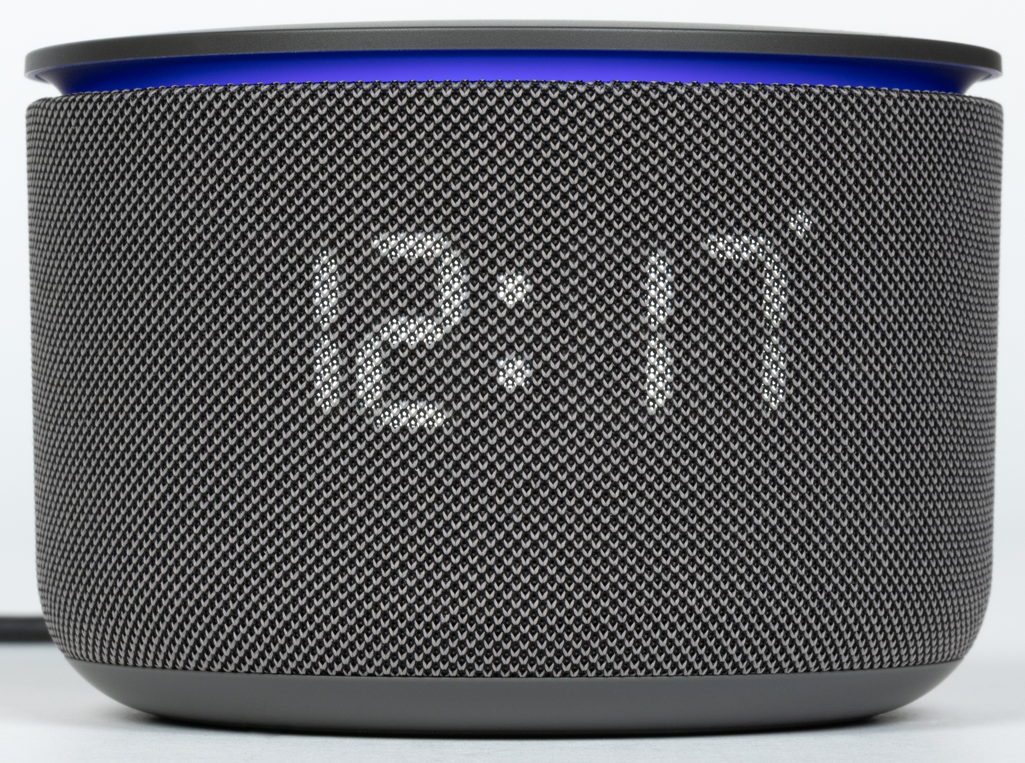 Центральная клавиша в виде значка Алисы подсвечивается, информируя о срабатывании кнопки, выключении микрофона и других событиях. Под сенсорной панелью расположена кольцевая анимированная LED-подсветка, хорошо заметная сбоку. Она не только добавляет эффектности внешнему виду колонки, но и выполняет информационную функцию: сопровождает общение с голосовым ассистентом, свайпы по панели и входящие звонки, а также синхронизируется с музыкой или отображаемыми данными — например, погодой. Яркость кольца и LED-дисплея регулируется автоматически — за это отвечает встроенный датчик освещенности.