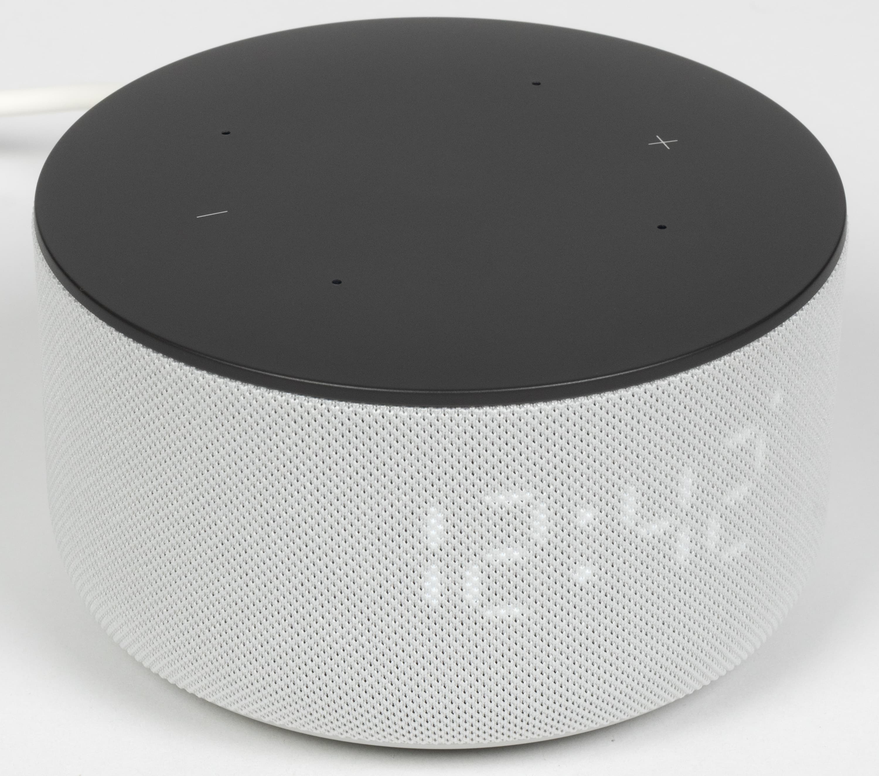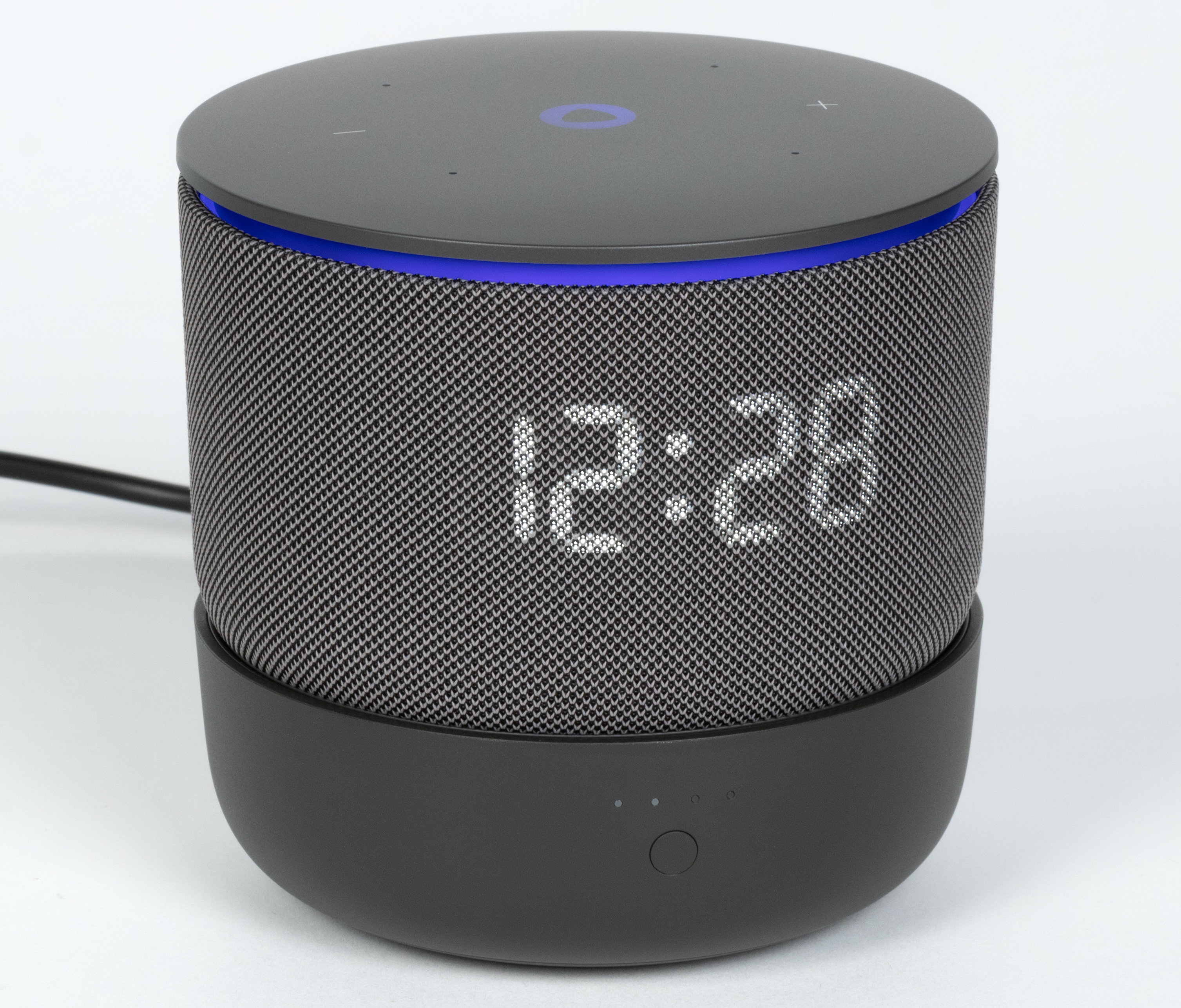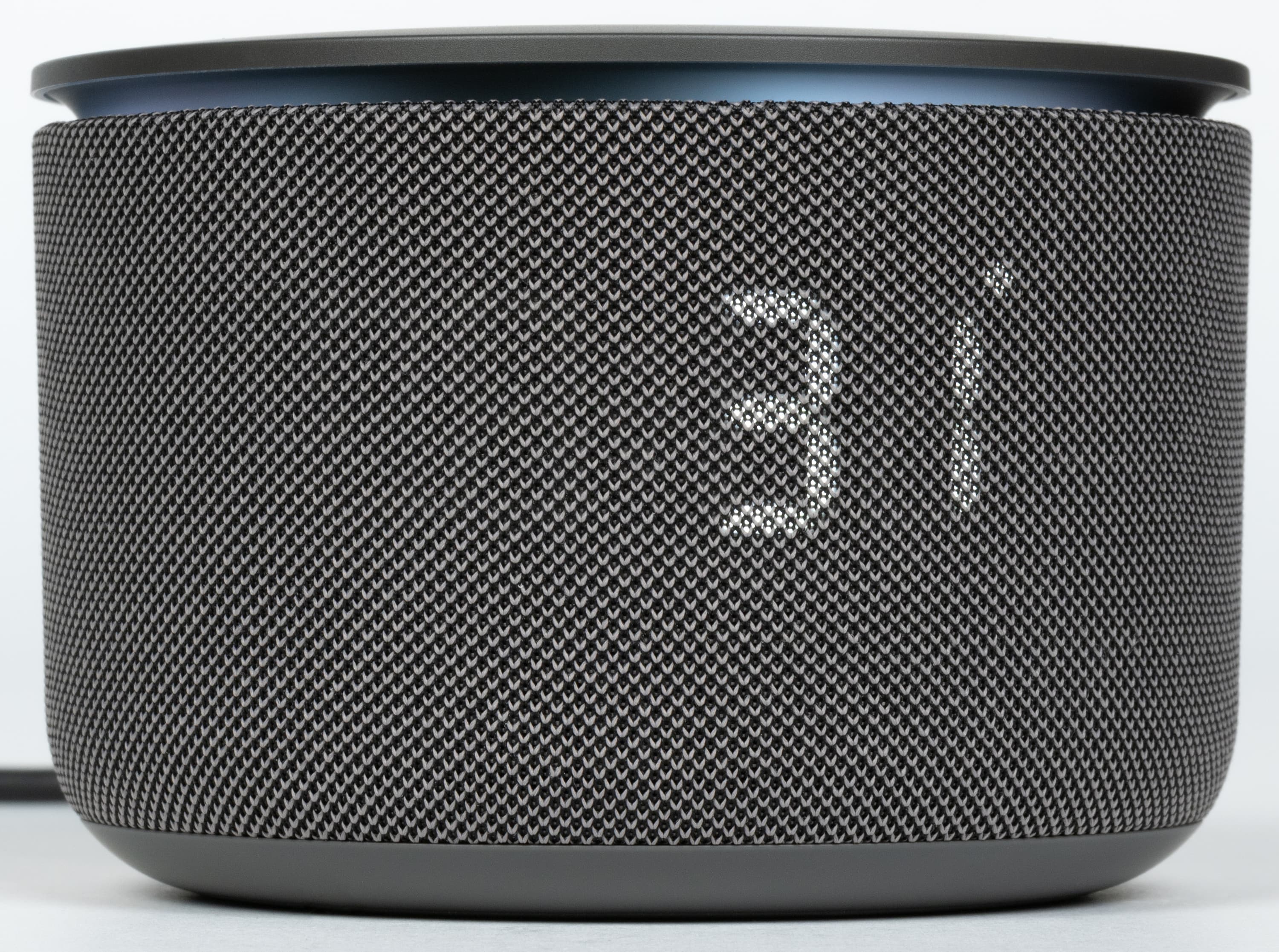 Центральная клавиша в виде значка Алисы подсвечивается, информируя о срабатывании кнопки, выключении микрофона и других событиях. Под сенсорной панелью расположена кольцевая анимированная LED-подсветка, хорошо заметная сбоку. Она не только добавляет эффектности внешнему виду колонки, но и выполняет информационную функцию: сопровождает общение с голосовым ассистентом, свайпы по панели и входящие звонки, а также синхронизируется с музыкой или отображаемыми данными — например, погодой. Яркость кольца и LED-дисплея регулируется автоматически — за это отвечает встроенный датчик освещенности.