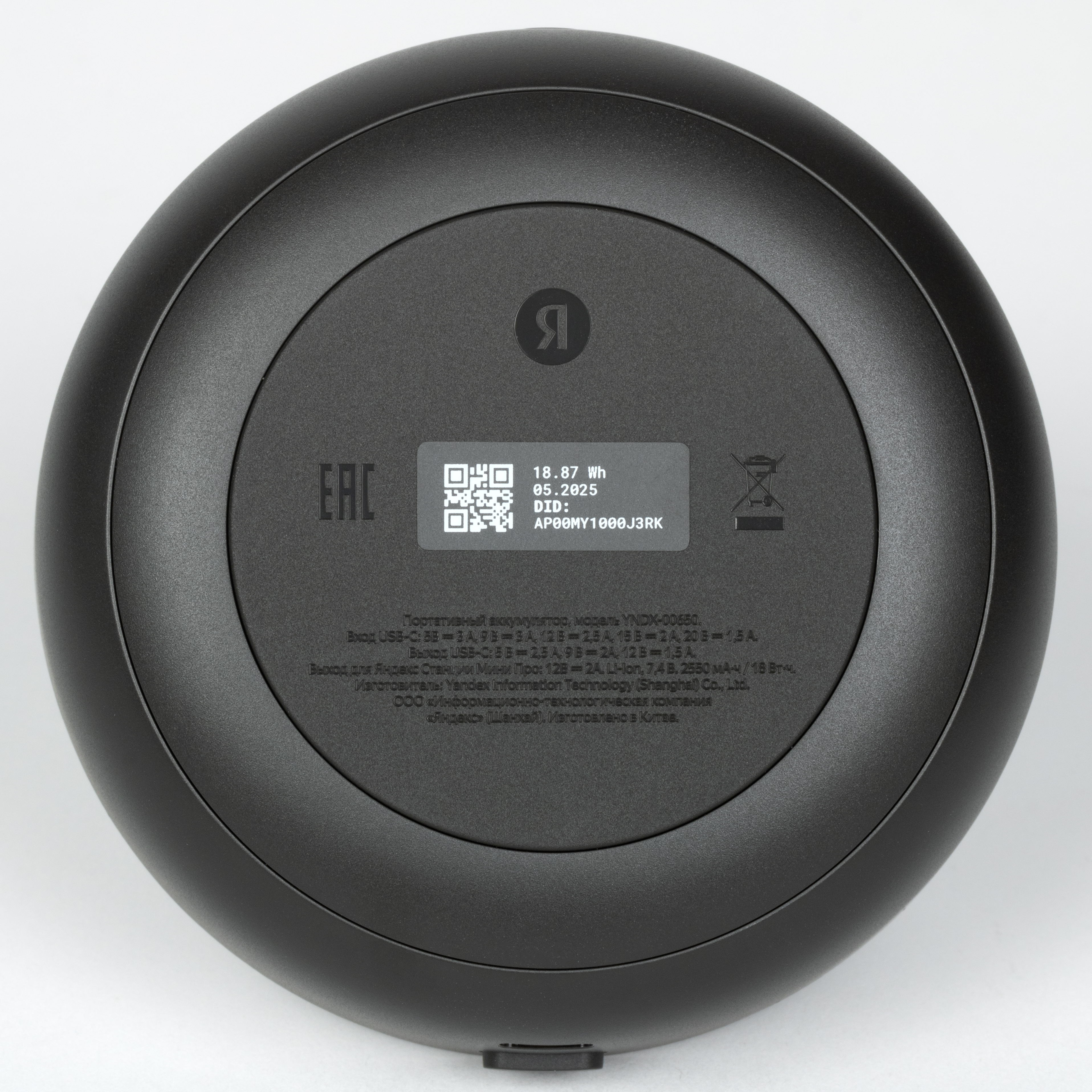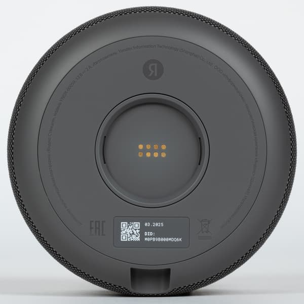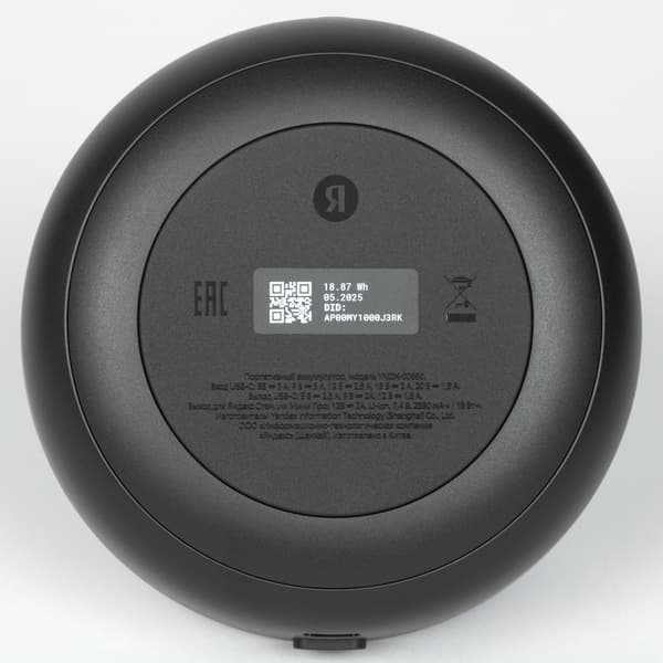 По центру нижней панели расположены коннектор и крепление для съемных модулей. Вокруг углубления предусмотрена силиконовая накладка, которая обеспечивает устойчивое положение колонки на горизонтальной поверхности. На нее нанесены логотип, значки сертификации и краткая информация об устройстве.