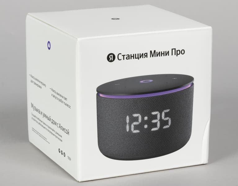 «Станция Мини 3 Про» упакована в привычную для компактных колонок «Яндекса» картонную коробку с изображением устройства, его названием, краткими характеристиками и примерами голосовых команд для Алисы. Внутри колонка и аксессуары надежно зафиксированы с помощью картонного ложемента, так что все доезжает в целости и сохранности.
