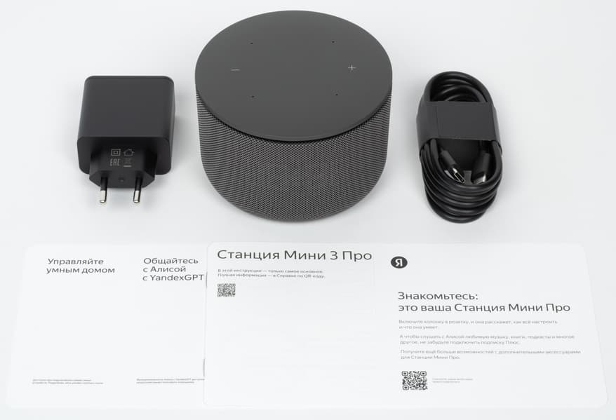 В коробке мы обнаружили только само устройство и инструкцию, ничего больше и не нужно — подходящий блок питания и кабель уже идут в комплекте с колонкой.