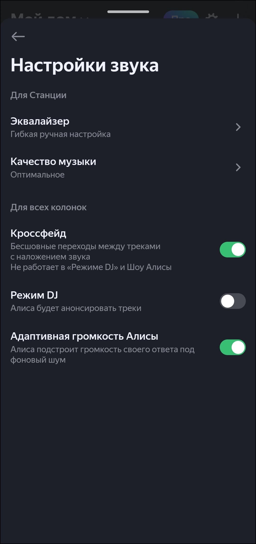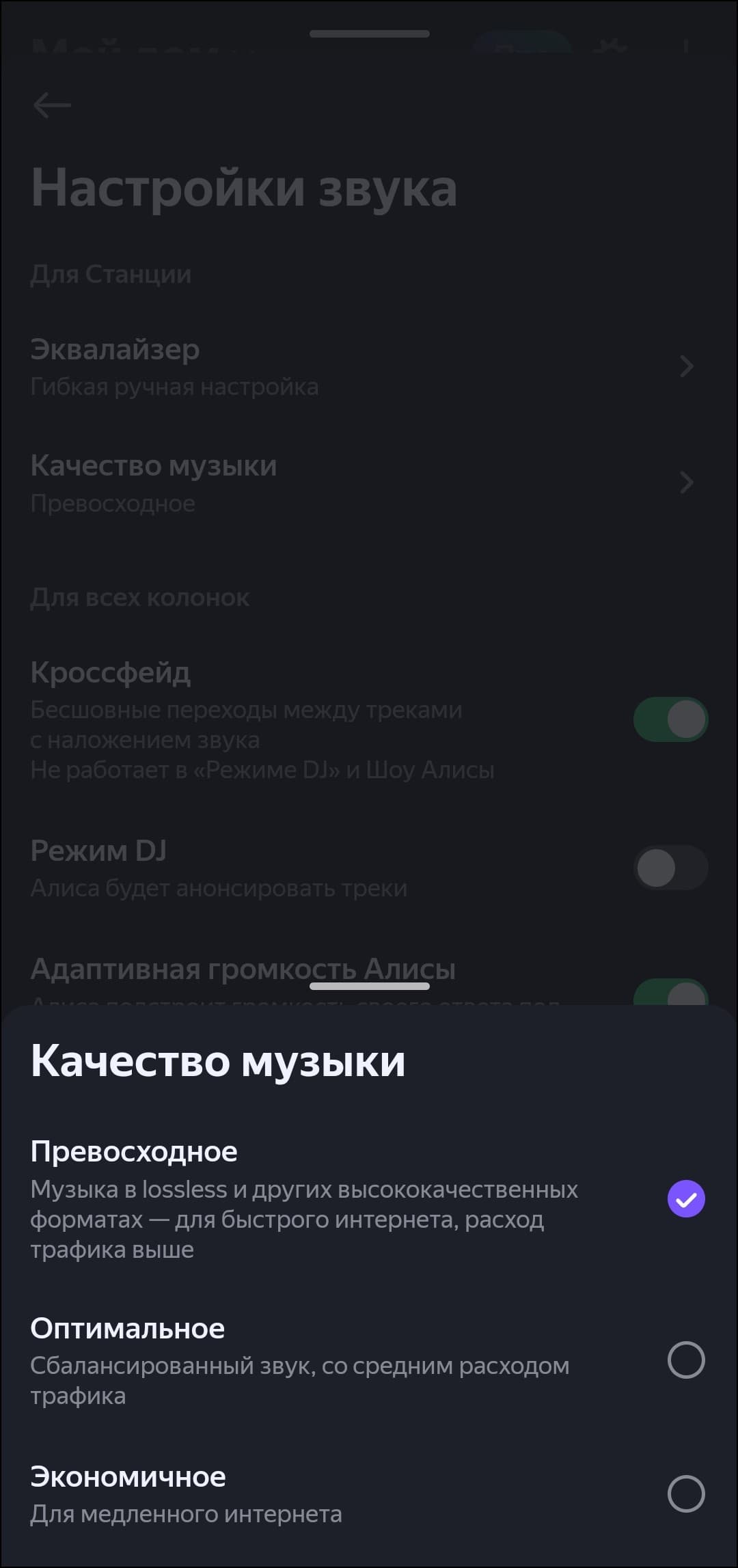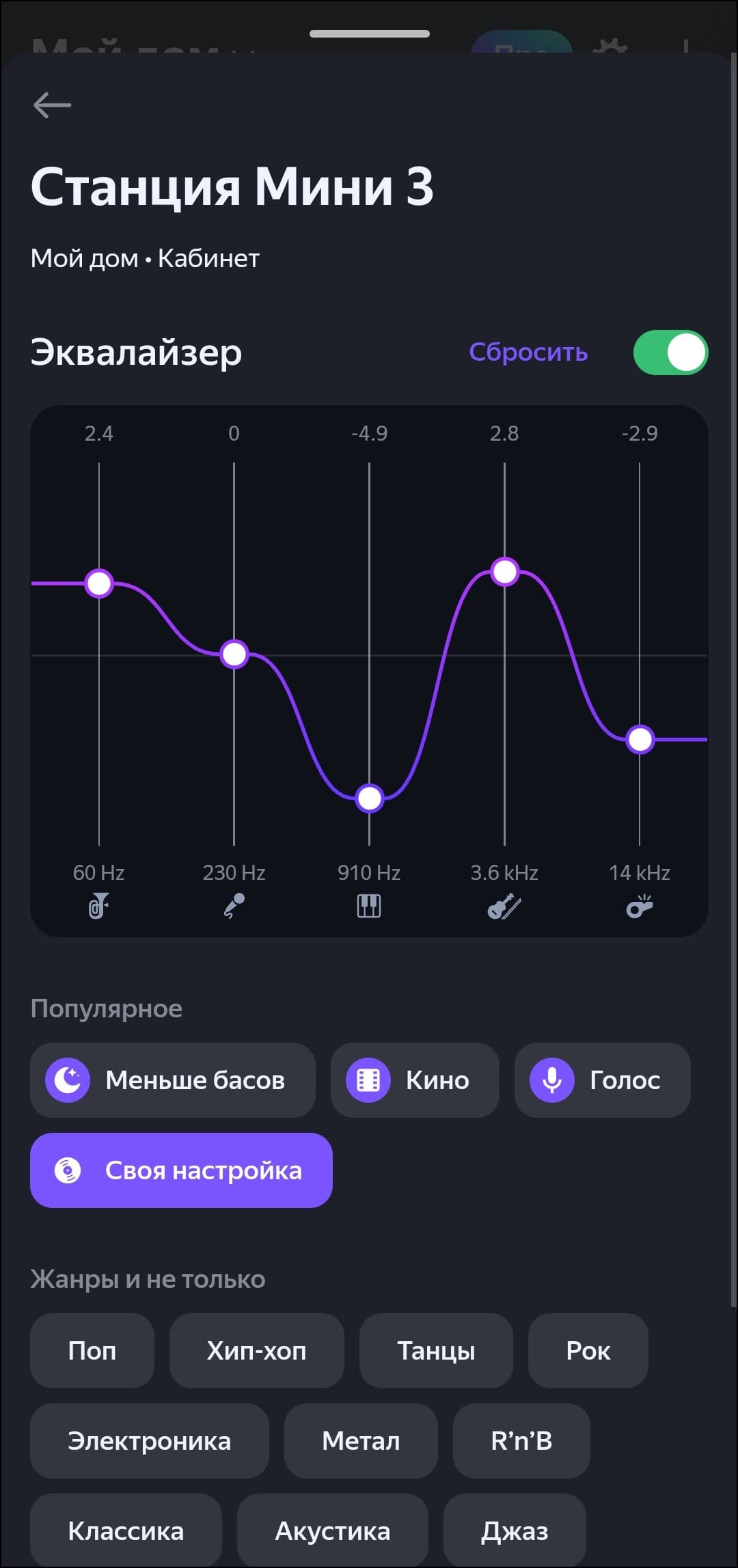 Звучание колонки гибко настраивается, но только при воспроизведении контента из «Яндекс.Музыки» — при Bluetooth-подключении настройки придется производить на источнике звука. Качество музыки можно выбирать — наконец-то «Яндекс.Музыка» поддерживает lossless, но для «Станции Мини» будет достаточно и того, что разработчики называют «оптимальным качеством». Треки могут плавно сменять друг друга с помощью кроссфейда, голосовой ассистент может проговаривать названия композиций и адаптировать свою громкость под уровень окружающего шума. Есть и графический эквалайзер: всего пять полос, но для маленькой колонки и это — уже отлично. Производитель предлагает больше десятка пресетов, плюс можно создать свой.