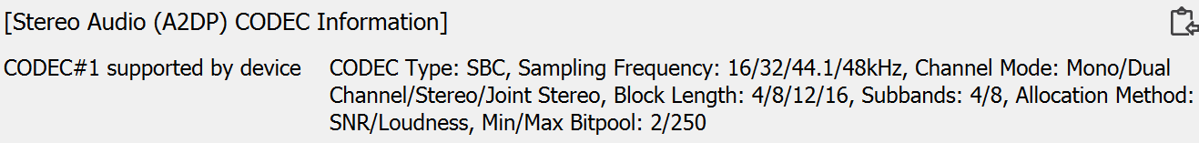 Кодек один — базовый SBC, для маленькой колонки с пластиковым корпусом его возможностей однозначно хватит с запасом. При этом максимум параметра Bitpool у него выставлен на уровне 250, тогда как рекомендованный профиль High Quality подразумевает значение 51. Так что отработает он на максимуме своих возможностей.