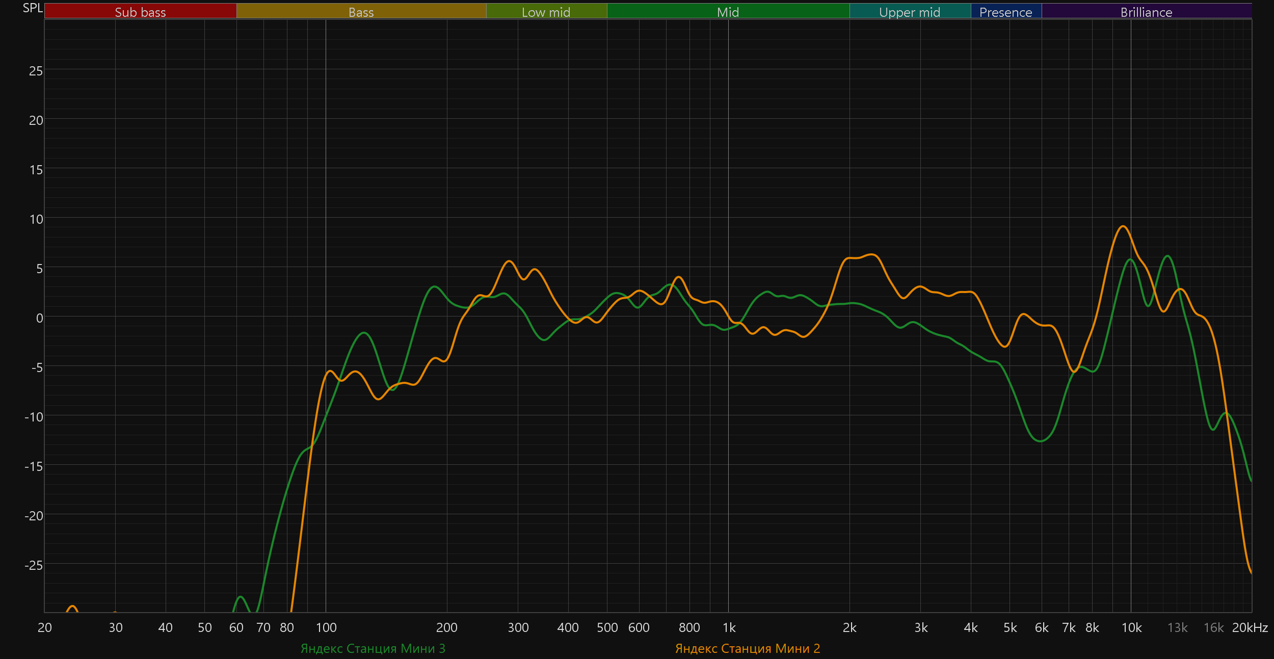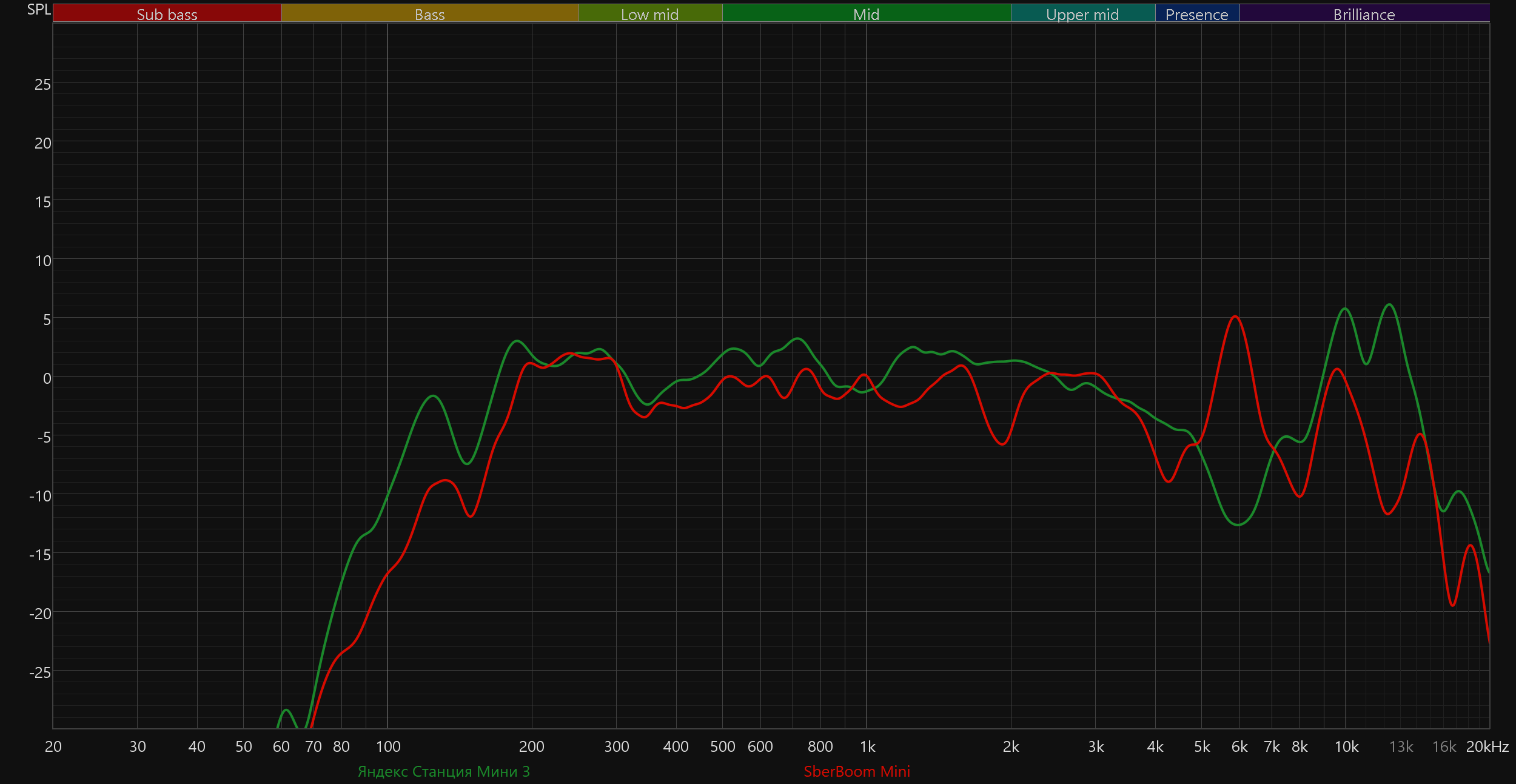 Вышедшая недавно SberBoom Mini 2 и в области НЧ-диапазона не отстает, и звучит куда приятнее и ровнее — тут однозначная победа. А вот с прошлой SberBoom Mini почти паритет — «особенности» у каждой колонки свои, но в целом по уровню сбалансированности звучания они отличаются мало.