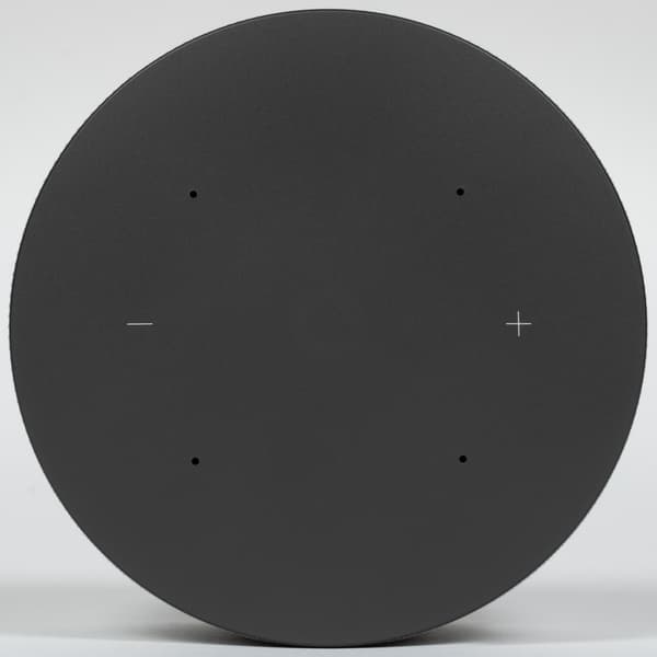 Сверху находится панель с разноцветным индикатором по центру, а также сенсорными клавишами управления. Судя по техническим характеристикам колонки, в нее установлено три микрофона для взаимодействия с голосовым ассистентом. А отверстия на панели четыре — в «лишнем» разместили датчик освещенности, с помощью которого производится автоматическая регулировка яркости экрана.