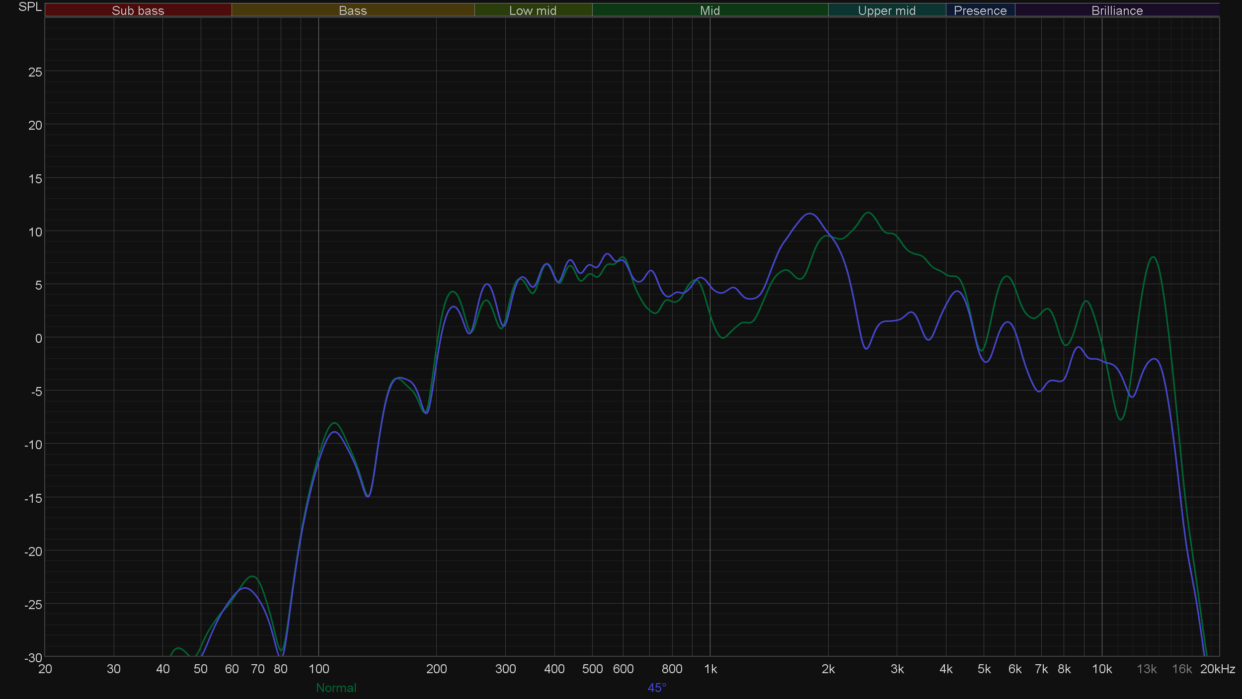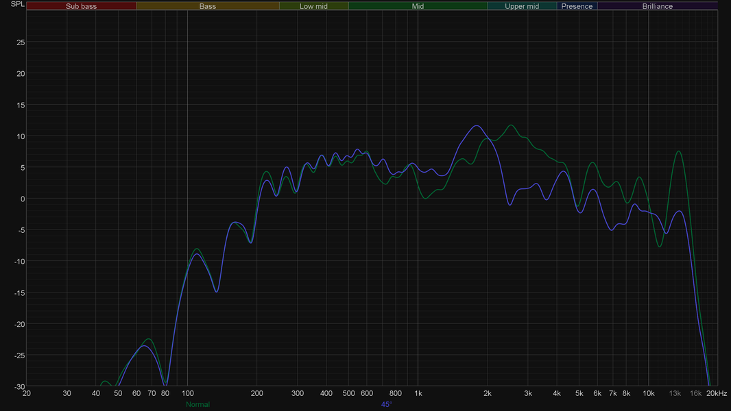 По традиции, для компактных колонок мы проводим две серии измерений. Первую — расположив микрофон по нормали к колонке на расстоянии около 60 см. А вторую — сместив микрофон вверх на угол 45°, так как часто во время работы устройство находится примерно на уровне пояса слушателя.