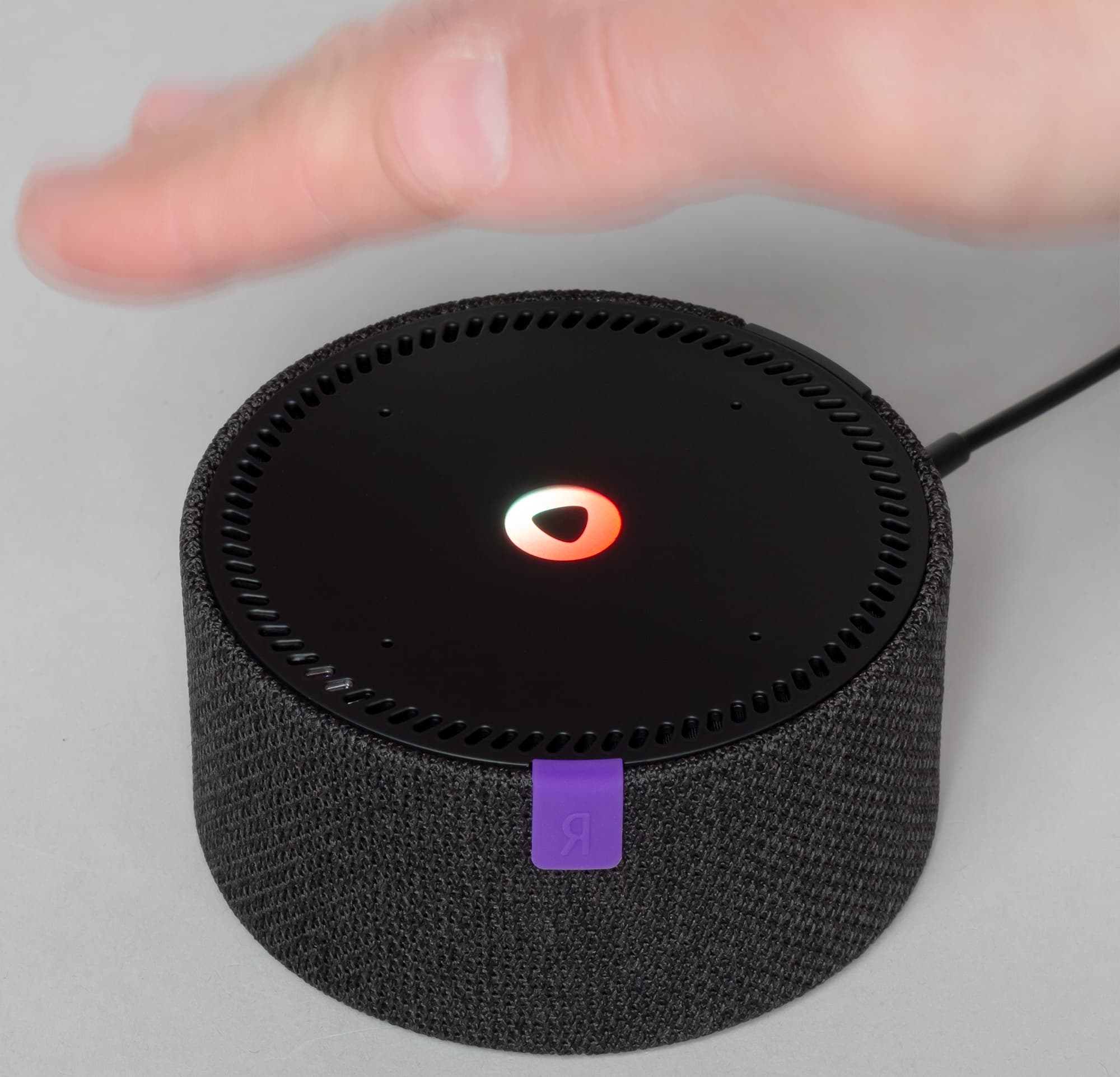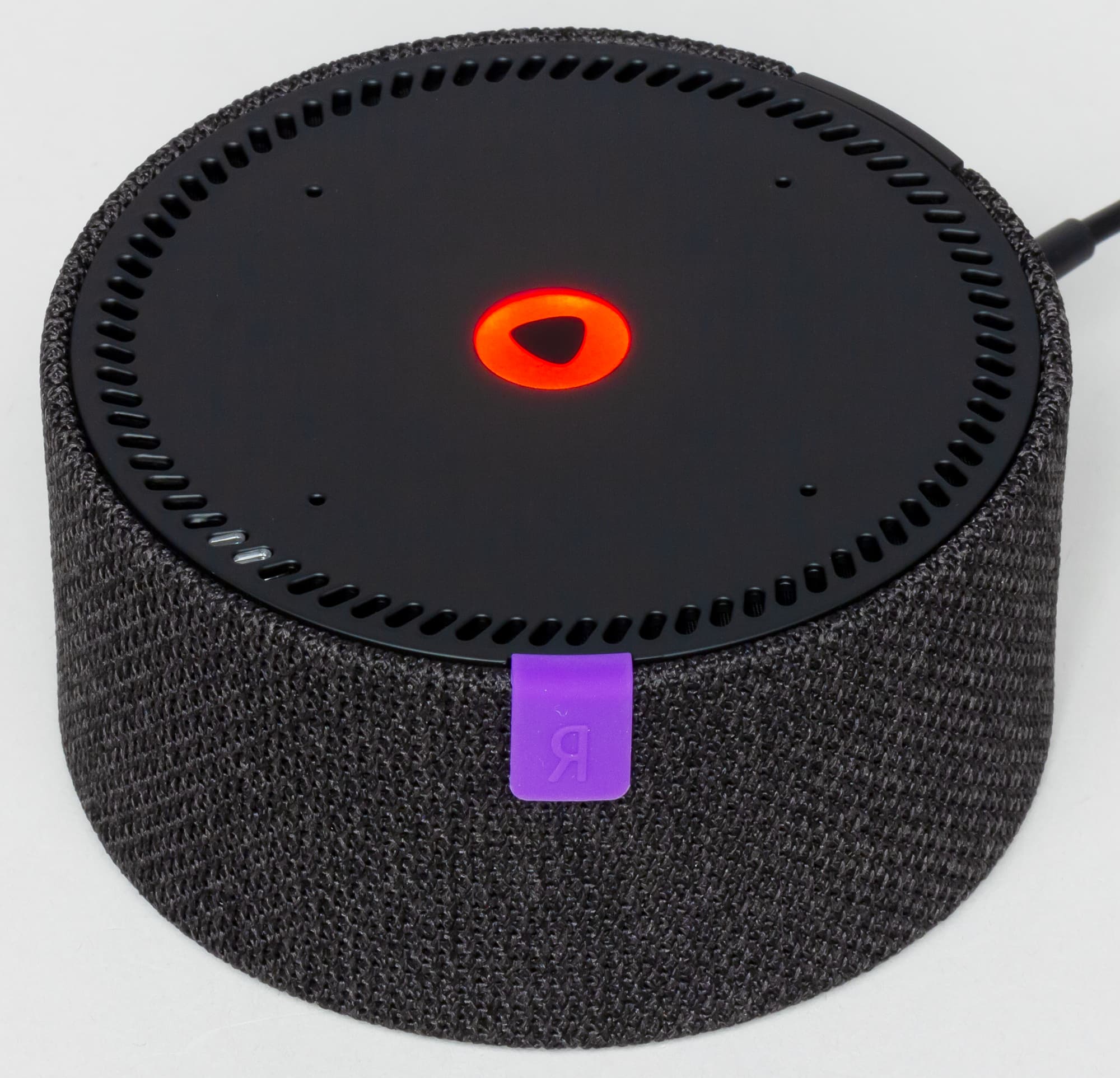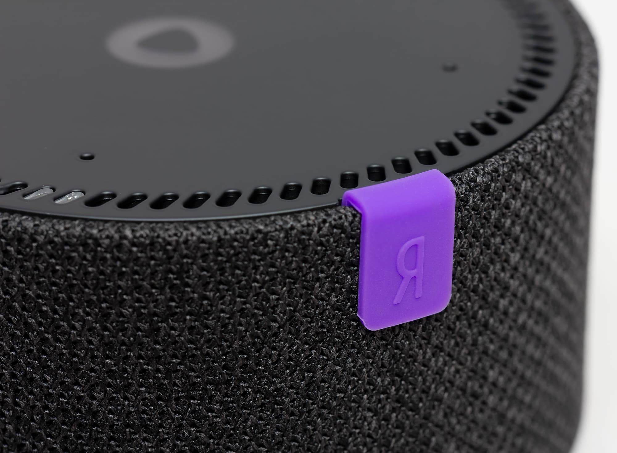 Небольшой фиолетовый элемент с логотипом «Яндекса» в основном выполняет чисто декоративную функцию, но не только — рядом с ним расположен датчик, отвечающий за распознавание жестов. Соответственно, руку для управления логично размещать где-то поблизости.