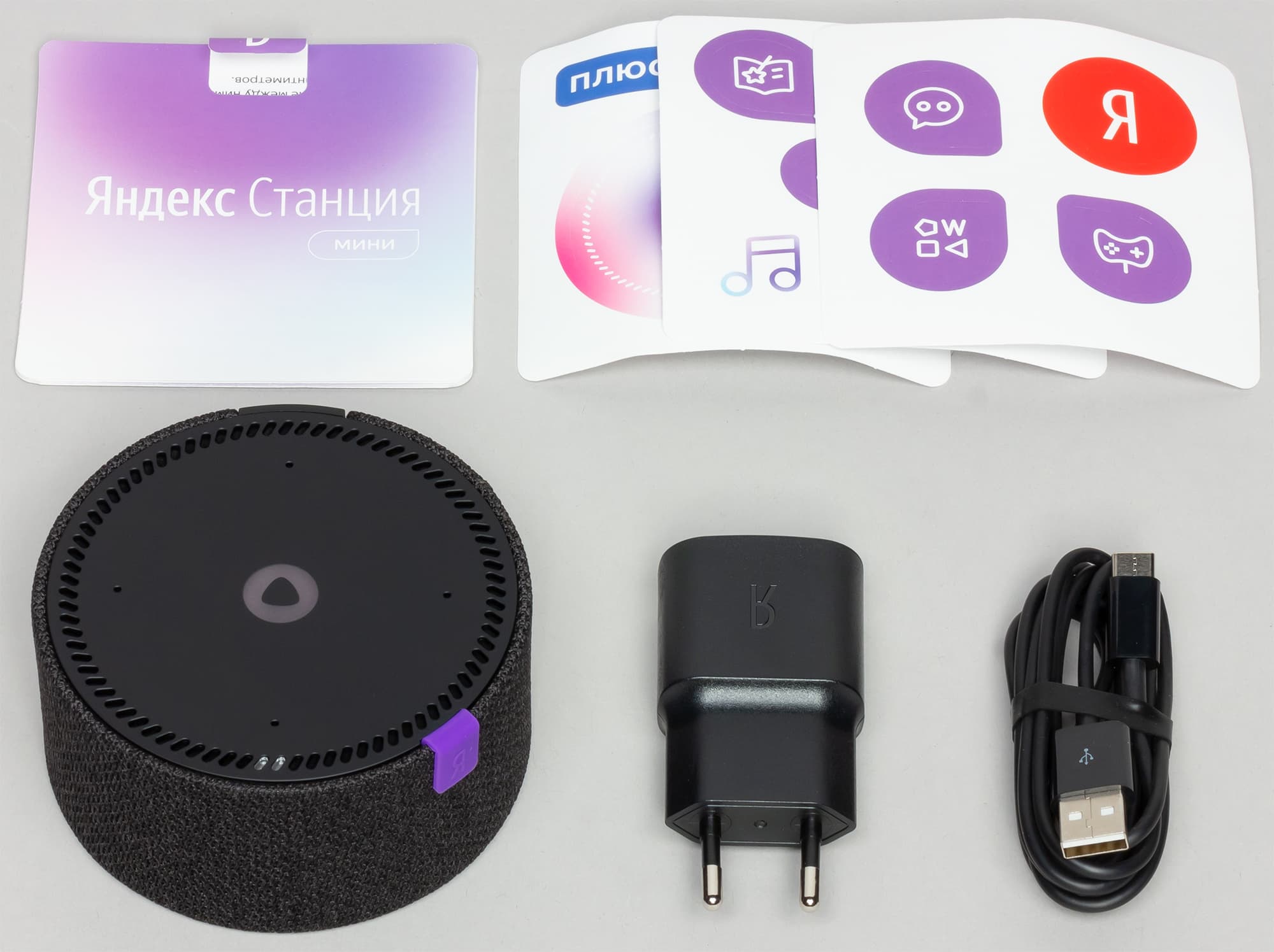 В комплект помимо самого устройства входят адаптер питания, кабель для зарядки, документация и набор стикеров.