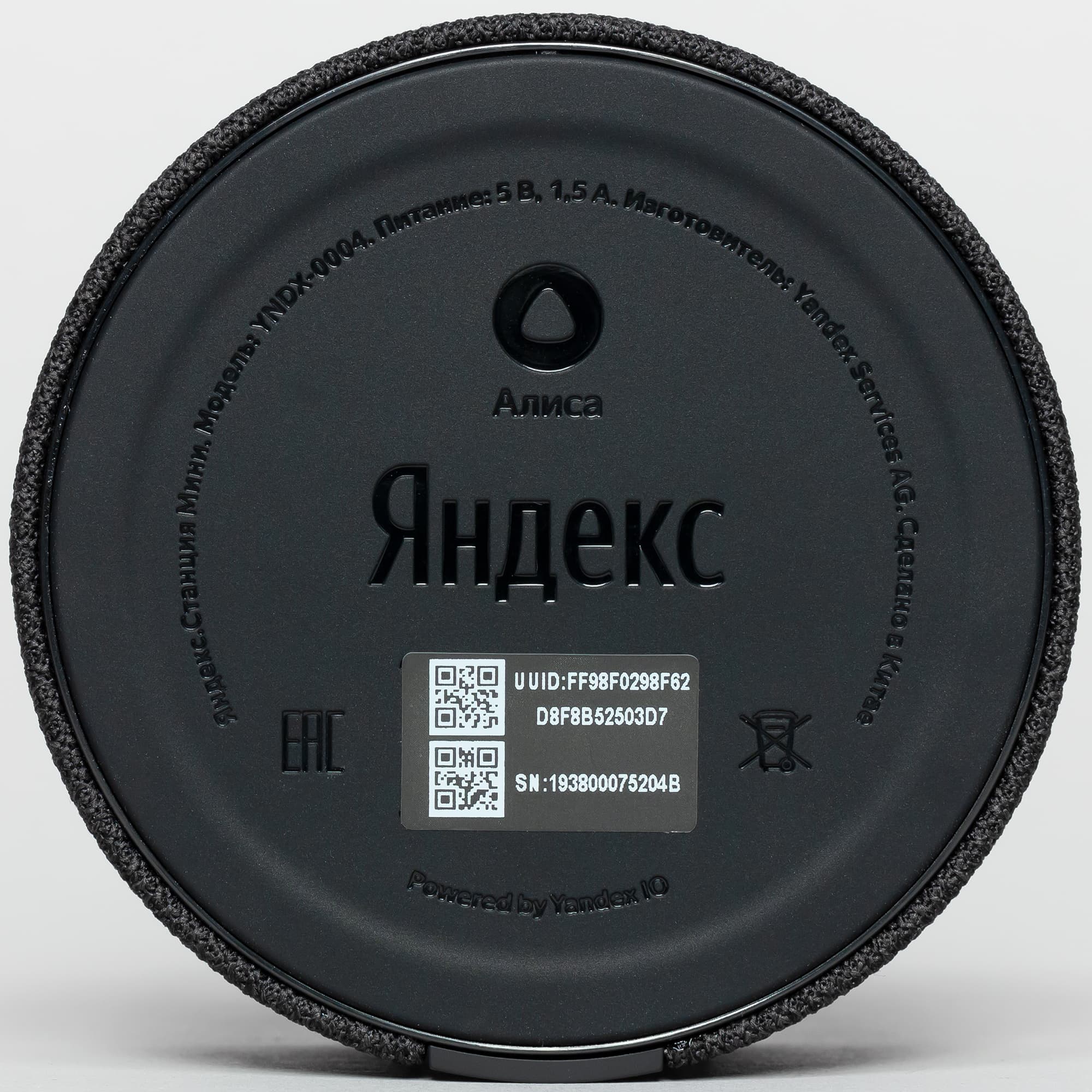 Нижняя часть корпуса прорезинена — колонка не скользит даже по стеклянным поверхностям. Здесь же размещены логотипы, номер модели и серийный номер, а также прочая информация об устройстве и производителе.