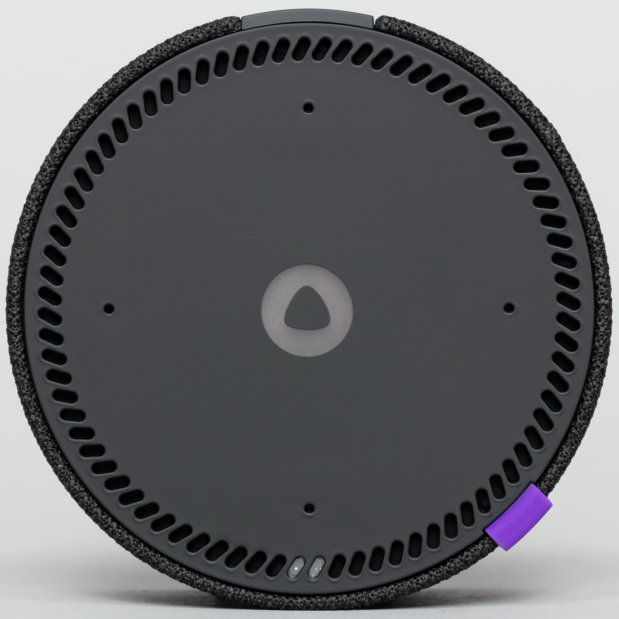 На верхней панели мы видим ряд расположенных по кругу отверстий, под двумя из которых отчетливо различим тот самый TOF-датчик. Чуть ближе к центру расположены четыре отверстия микрофонов, а в середине — индикатор режима работы.