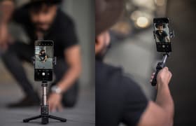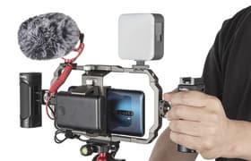 Комплект принадлежностей SmallRig представляет собой готовое решение для видеосъемки и стриминга при помощи смартфона. В его составе универсальная клетка с боковыми ручками, имеющая сверху 2 «холодных башмака» и 16 отверстий со стандартной штативной резьбой. В ней можно закрепить смартфоны шириной от 67 до 85 мм, а также пауэрбанки шириной от 53 до 85 мм. В набор входят также мини-штатив, портативный осветитель, микрофон, аудиокабели и адаптеры для подключения внешнего питания и микрофона к iPhone и коннектору USB Type C. Комплект практически исчерпывающий. Он обеспечивает все основные потребности влогера и стримера; недостает лишь беспроводного управления видеосъемкой. В использовании конструкция удобна, она демонстрирует хорошие возможности стабилизации изображения. Поэтому SmallRig All in One Video Kit 3384 представляется нам хорошим выбором.