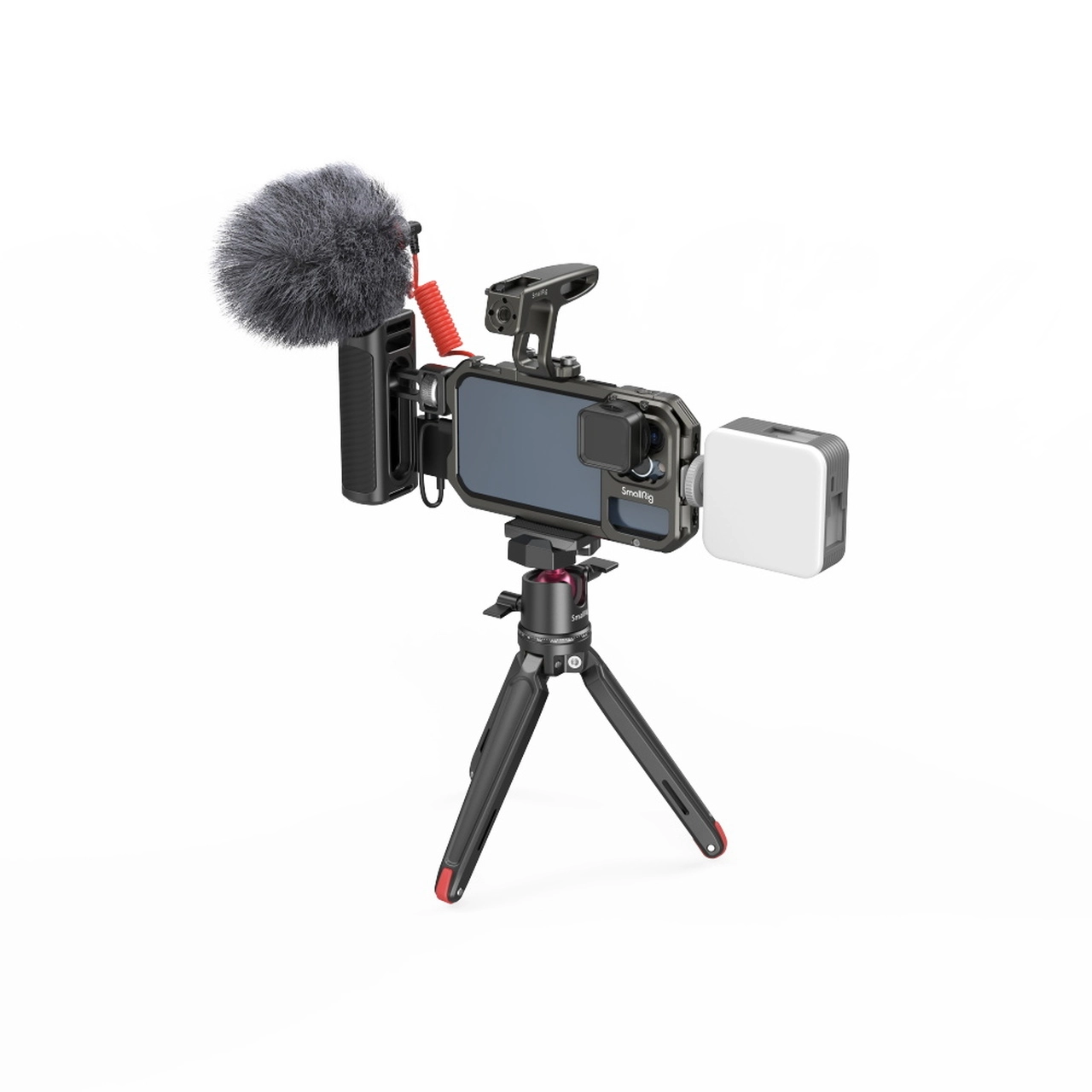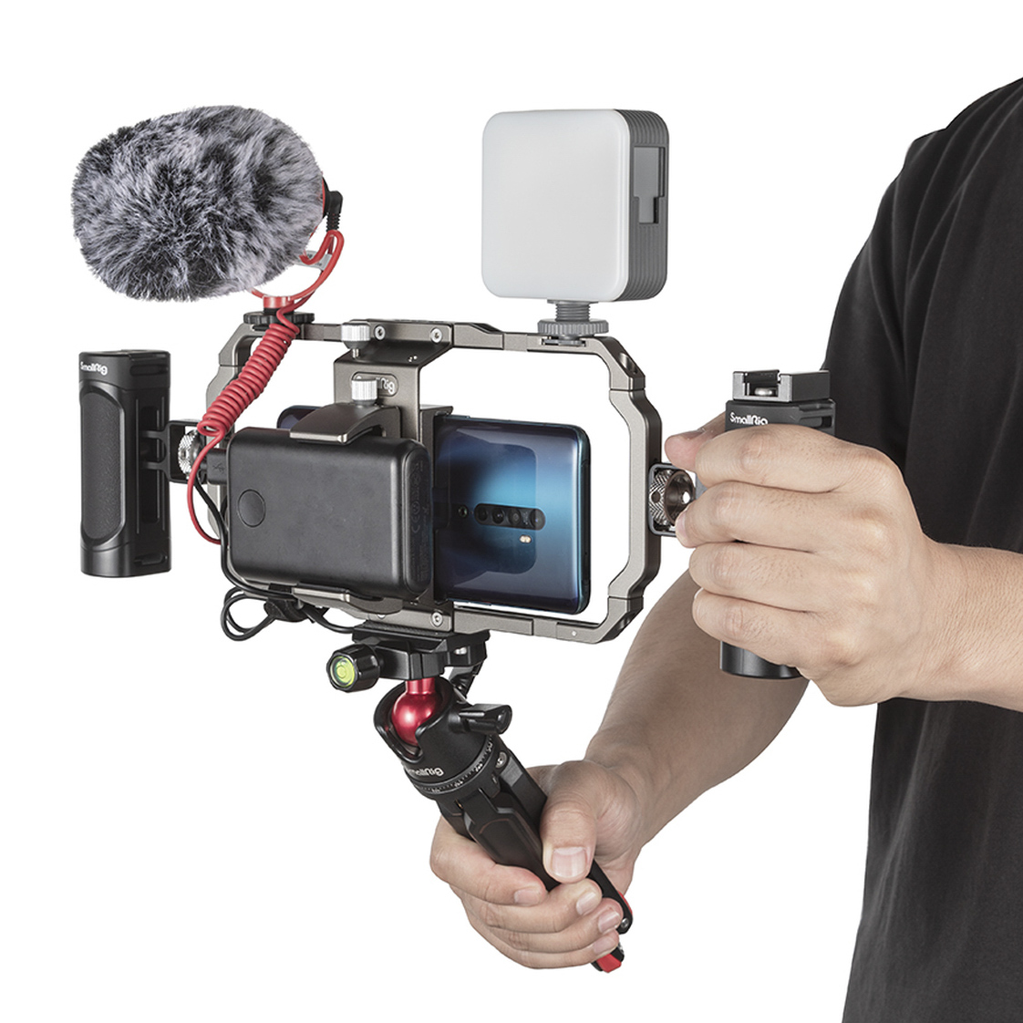 Комплект принадлежностей SmallRig представляет собой готовое решение для видеосъемки и стриминга при помощи смартфона. В его составе универсальная клетка с боковыми ручками, имеющая сверху 2 «холодных башмака» и 16 отверстий со стандартной штативной резьбой. В ней можно закрепить смартфоны шириной от 67 до 85 мм, а также пауэрбанки шириной от 53 до 85 мм. В набор входят также мини-штатив, портативный осветитель, микрофон, аудиокабели и адаптеры для подключения внешнего питания и микрофона к iPhone и коннектору USB Type C. Комплект практически исчерпывающий. Он обеспечивает все основные потребности влогера и стримера; недостает лишь беспроводного управления видеосъемкой. В использовании конструкция удобна, она демонстрирует хорошие возможности стабилизации изображения. Поэтому SmallRig All in One Video Kit 3384 представляется нам хорошим выбором.
