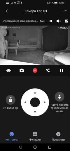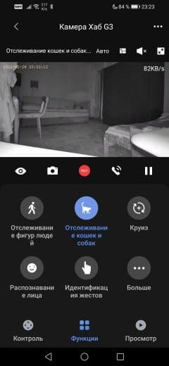 Интерфейс камеры в приложении имеет стандартную распространенную схему: вверху окно видеотрансляции, под ним — органы управления, через которые осуществляется доступ к часто используемым функциям. Еще ниже расположены три пиктограммы, меняющие состав инструментов. Так, выбрав пиктограмму Контроль, пользователь увидит виртуальный джойстик со стрелками, нажатия на которые поворачивают корпус камеры и наклоняют объектив. Эти же операции можно производить и свайпами прямо в окне трансляции. Вторая иконка, Функции, дает доступ к нескольким кнопкам, которые отвечают за активацию инструментов, распознающих фигуры, жесты и даже лица. Наконец, третья вкладка — Просмотр — содержит масштабируемую таймлинию видеоархива с окном просмотра.