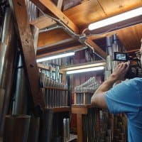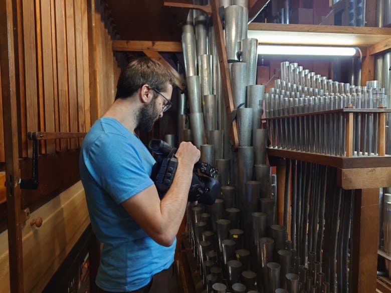 Как уже неоднократно упоминалось, орга́ну Большого зала консерватории более ста лет. Ме́ста для оператора внутри орга́на очень мало, не говоря уже о съемочном оборудовании. Даже стедикам, который мы использовали в нескольких сценах при съемке фильма «Симфония орга́на», далеко не везде спасает ситуацию, особенно на вертикальных лестницах и узких мостках. Стоит ли говорить, что ме́ста для отдельного фотографа с камерой здесь нет совсем. Поэтому в качестве фотографа выступил режиссер ролика Сергей Уваров, а в качестве камеры — смартфон Sony Xperia Pro-I.