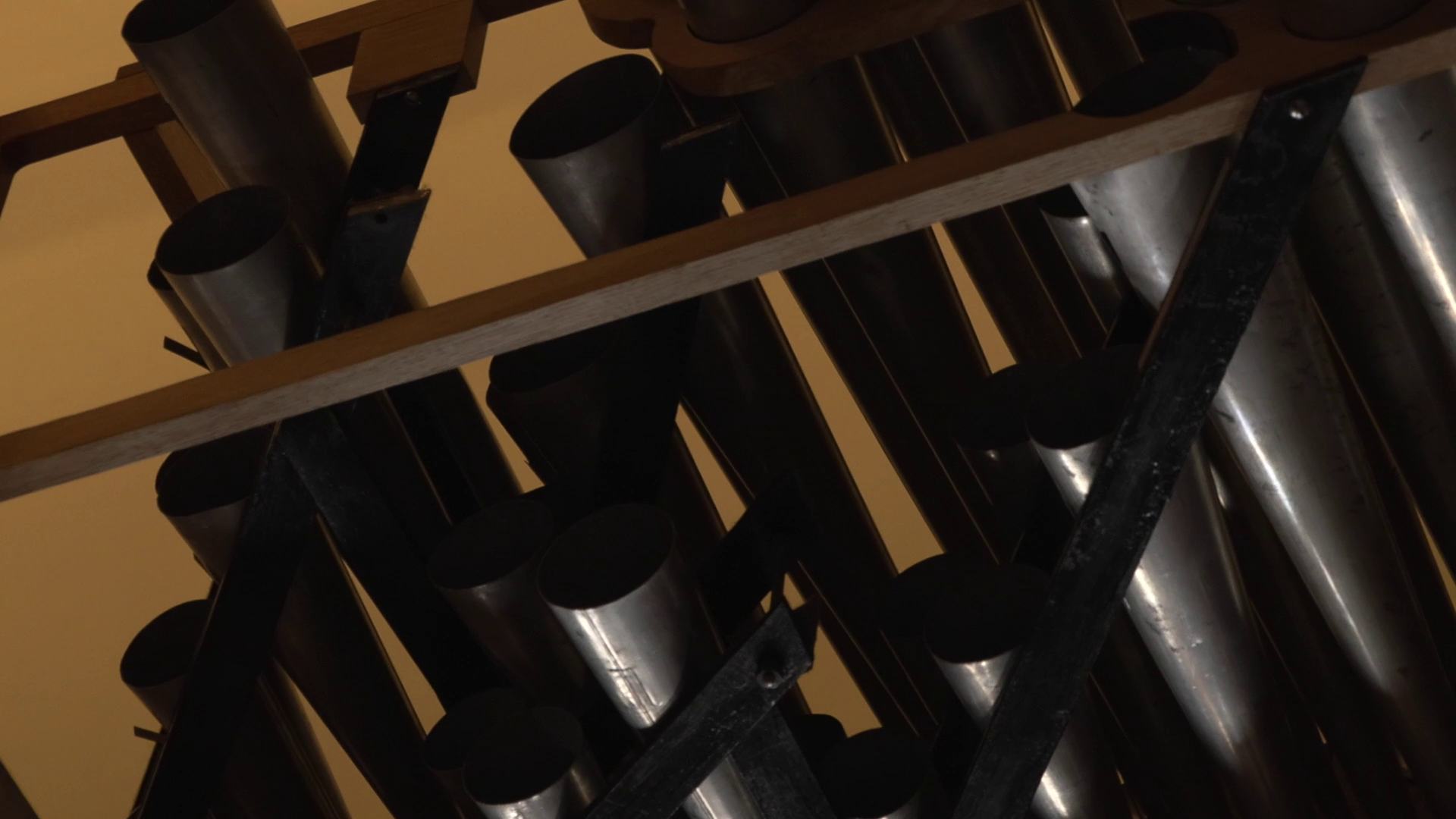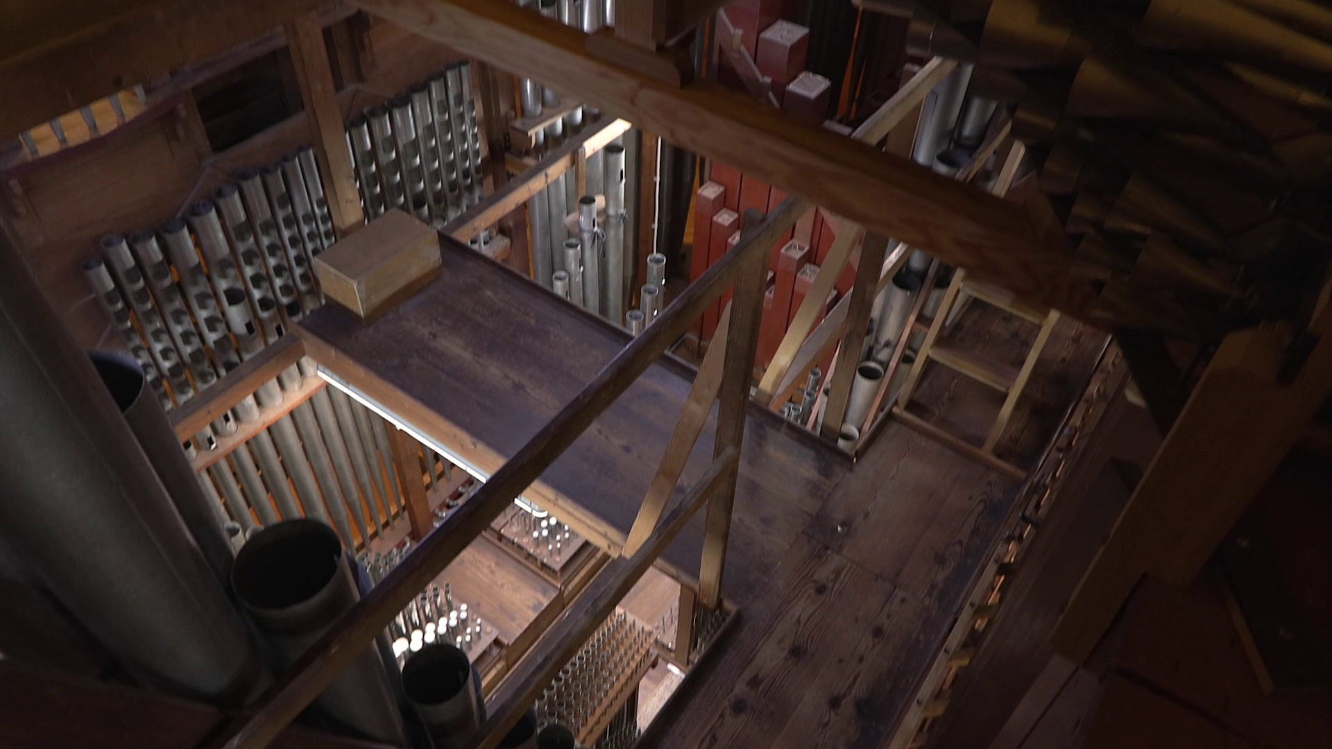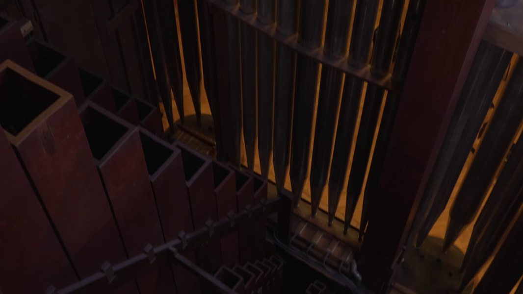 Сложнее было с прово́дками. Исходя из художественной задачи, нам важны были и скорость прово́док, и их длина. Скорость важна для соответствия музыки, длина — для выстраивания правильного «синтаксиса» монтажных фраз. И всё бы ничего, но, как уже было сказано, снимали мы с рук и без какой-либо дополнительной стабилизации, помимо предусмотренной в камере. Конечно, теоретически можно было использовать и штатив-треногу, хотя внутри орга́на это нежелательно (лишнее оборудование, к тому же громоздкое). Но многие планы тогда не удалось бы снять вовсе. Например, этот.