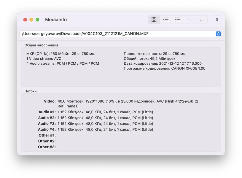 При подготовке к съемке некоторое время нам пришлось повозиться с настройками. Для того чтобы получить нужное качество изображения, мы провели ряд тестов и в итоге выбрали формат MXF 1080p 30 fps. Для видео здесь используется кодек AVC, битрейт составляет около 45 Мбит/с. Вот данные программы Mediainfo.