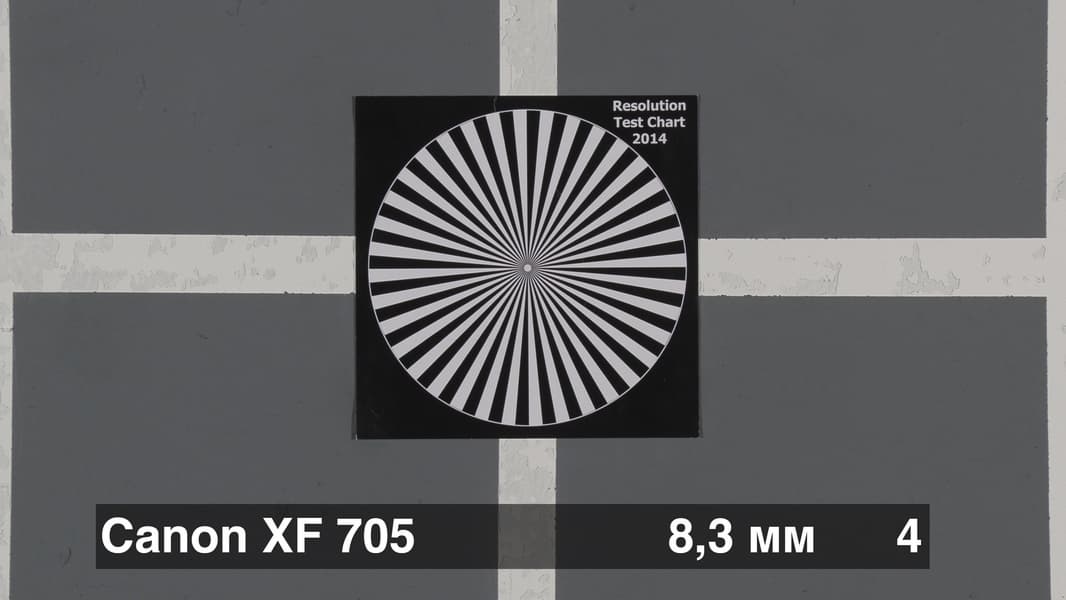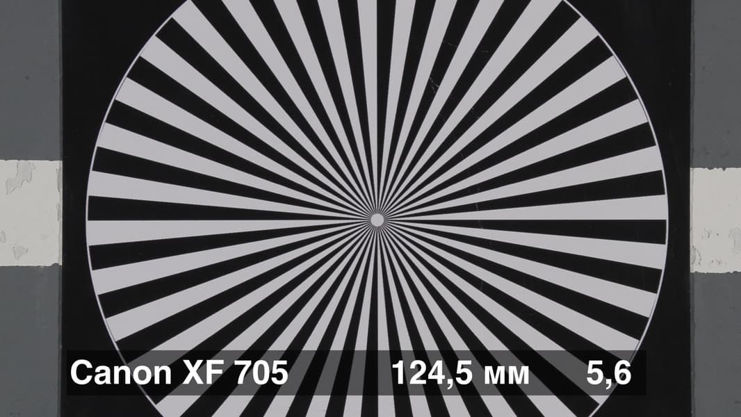 Canon XF705 на широком угле при диафрагме F4 показывает разрешение 69%. Это значит, что при съемке в 4К UHD на экране будет различимо 1490 линий по вертикали и 2650 по горизонтали. На длинном фокусе при диафрагме F5,6 были получены значения резкости в 60%. Если итоговое изображение на постпродакшне будет пересчитано в формат HD, то фотографическое разрешение возрастет до 93%-95%. Такая картина характерна для профессиональных камер, у которых изображение не подвергается внутри камеры обязательному программному увеличению резкости. Например, у любительских фотоаппаратов показатель резкости обычно составляет 80%-90% от разрешения матрицы, что вовсе не говорит о качестве оптики. Следует также сказать, что полученные показатели разрешения очень высокие для столь малого размера сенсора у камеры Canon XF705. Ведь размер светочувствительной ячейки в этом случае составляет менее трех микрон, и влияние дифракции и аберраций должно быть очень сильным.