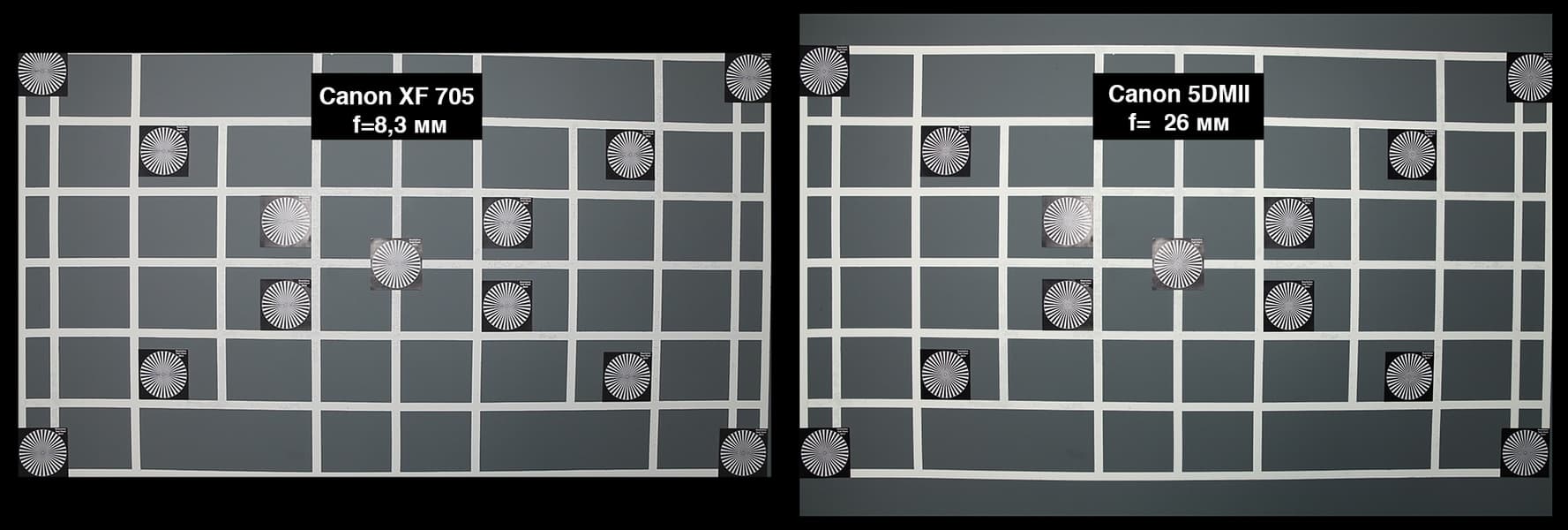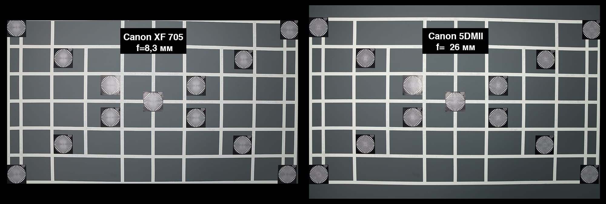 Камера Canon XF705 оснащена несъемным объективом с диапазоном фокусных расстояний 8,3—124,5 мм. В инструкции указан размер диагонали сенсора: 1 дюйм. Надо сказать, что в видеоиндустрии размер дюйма отличается от общепринятого, и равен он не 2,54 см, а намного меньше — около 17 мм. В интернете встречается информация, что у производителей камер дюймовым сенсором сегодня считается размер 13,2×8,8 мм. Соотношение сторон такого сенсора равно 3:2, что не соответствует формату снимаемого камерой кадра 16:9. К тому же, в инструкции приведены значения эквивалентного фокусного расстояния в пересчете на полноформатный фотоаппарат: 28,3—424,6 мм. Противоречивые сведения побудили провести тест и самостоятельно выяснить угол зрения объектива.