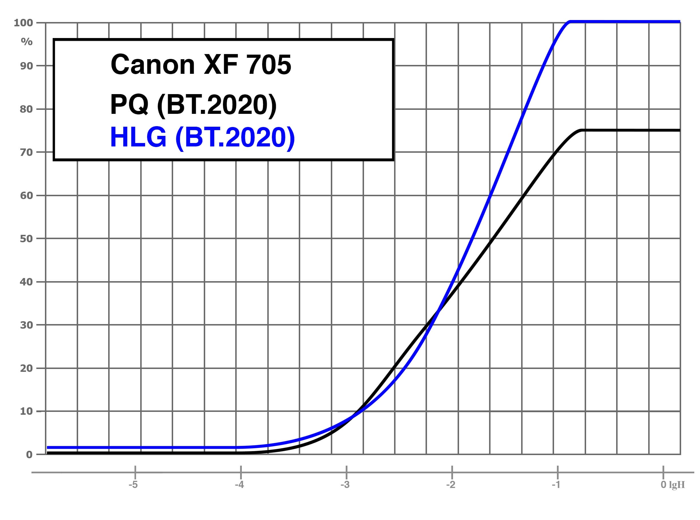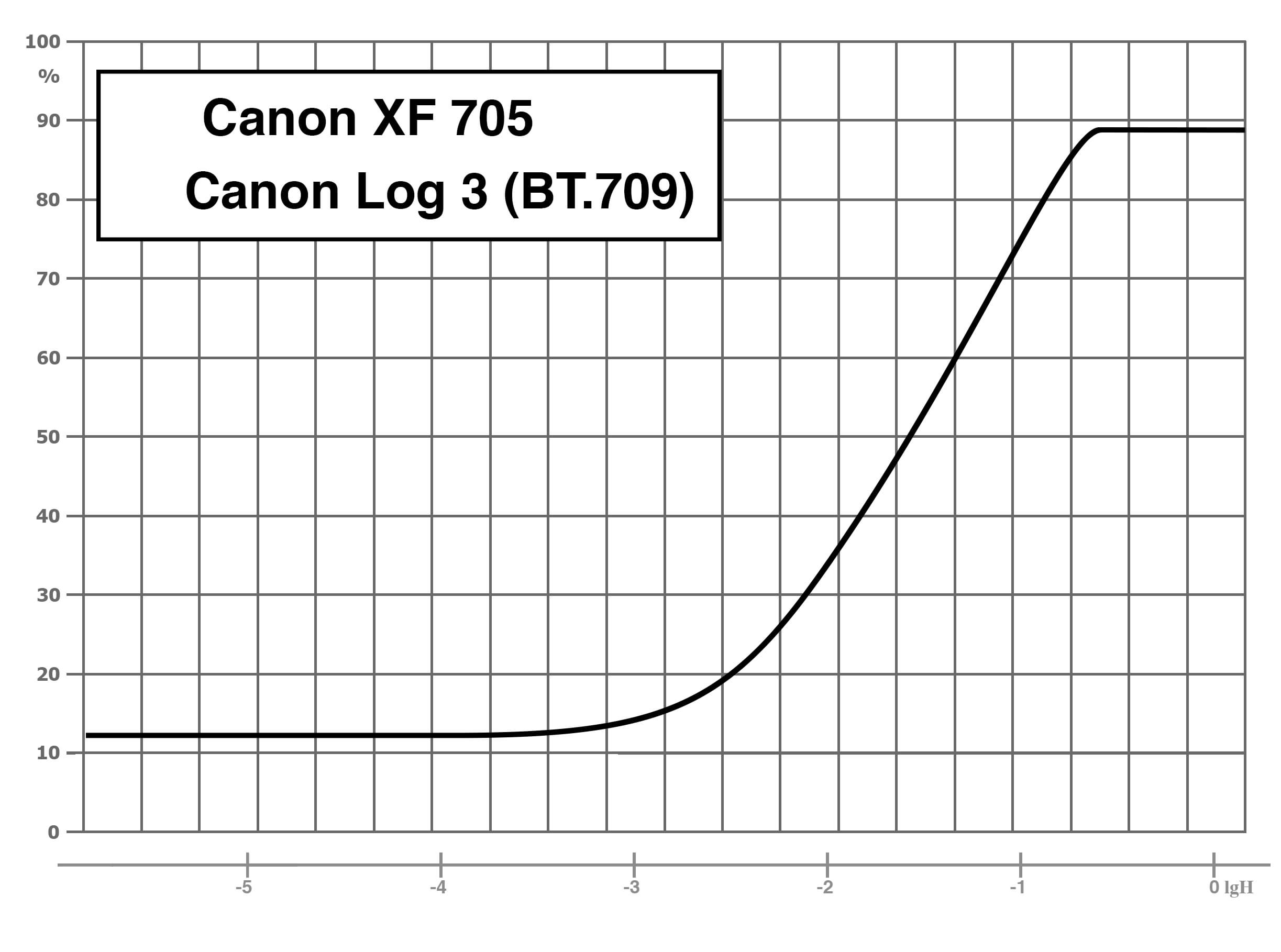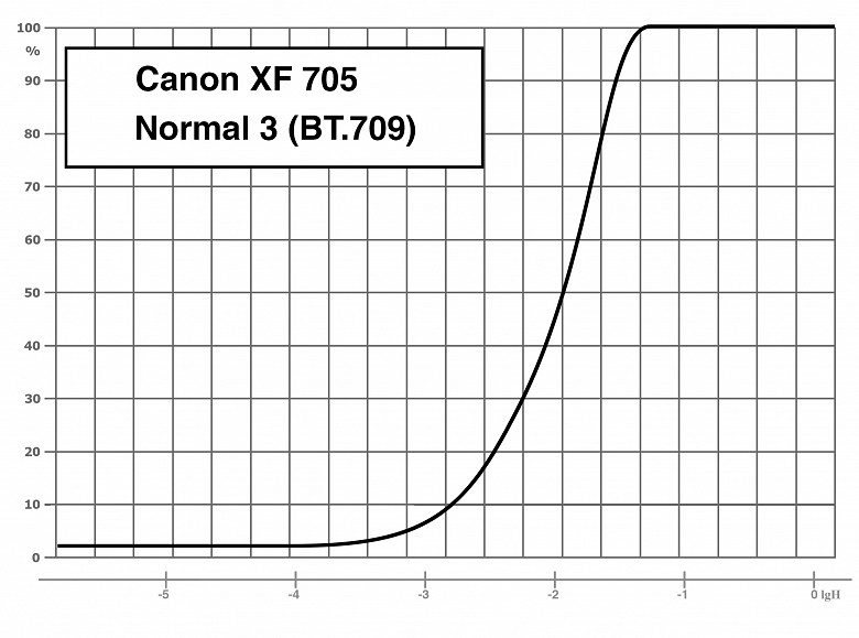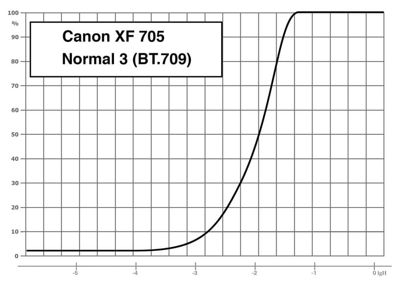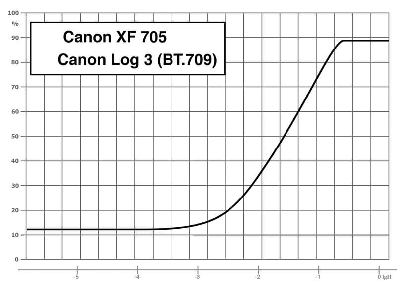 «Canon Log 3»: гамма Canon Log 3 / цветовое пространство BT.709/BT.2020. При съемке в Canon Log 3 используется весь динамический диапазон камеры, который, по измерениям, составил 12 ступеней экспозиции. Применение этой гамма-кривой подразумевает последующую постобработку снятого материала. В камере Canon XF705 при съемке в логарифмической гамме есть возможность применять коррекцию LUT к изображению, выводимому на монитор или разъемы SDI/HDMI.