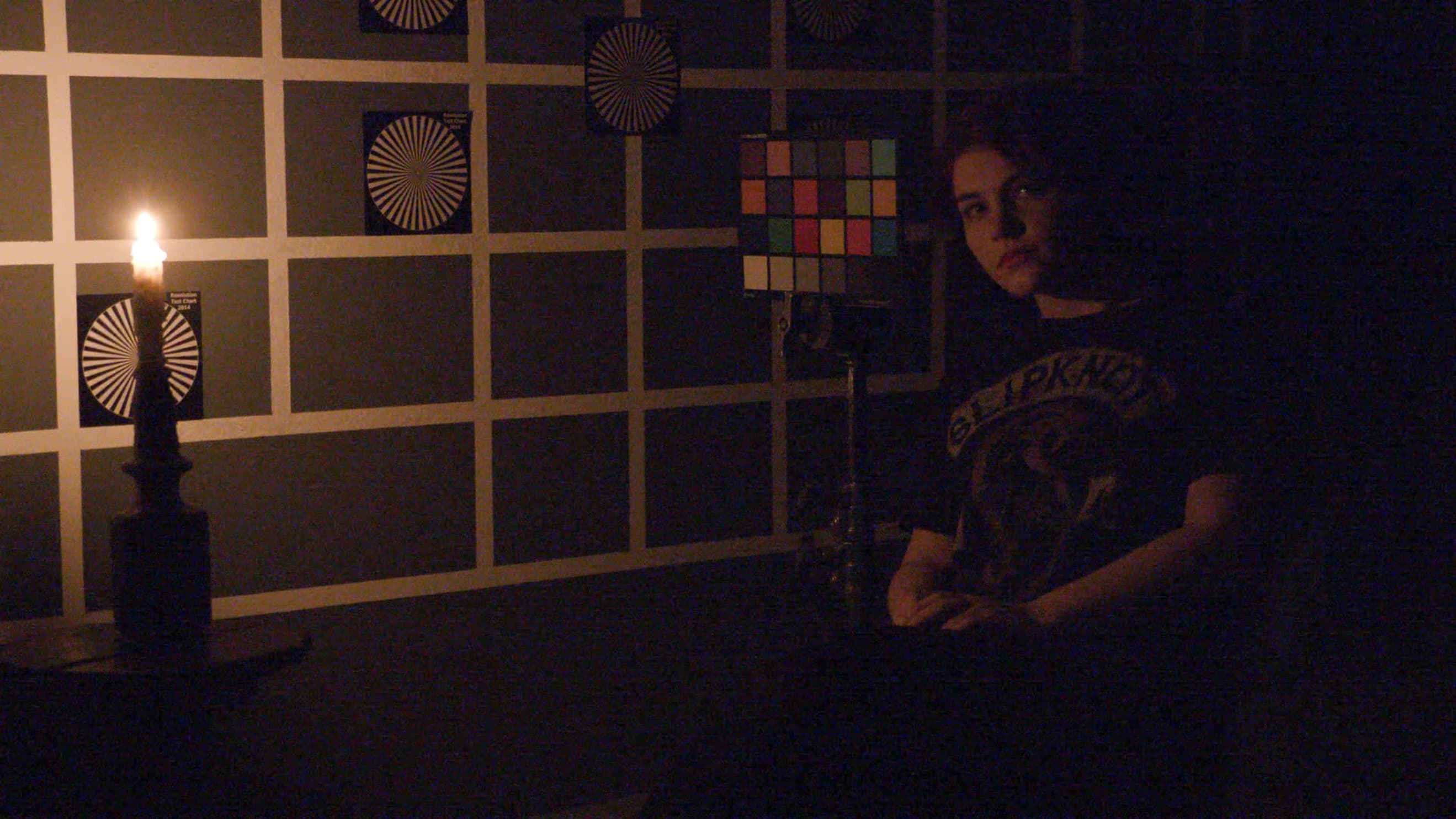В инструкции к камере указаны возможности съемки при освещенности 2,5 люкса с максимальным уровнем усиления 33 дБ. Для проверки этого параметра в качестве источника света была использована обычная свеча, а тестовая шкала и лицо модели были расположены на расстоянии, обеспечивающем требуемый уровень освещенности.