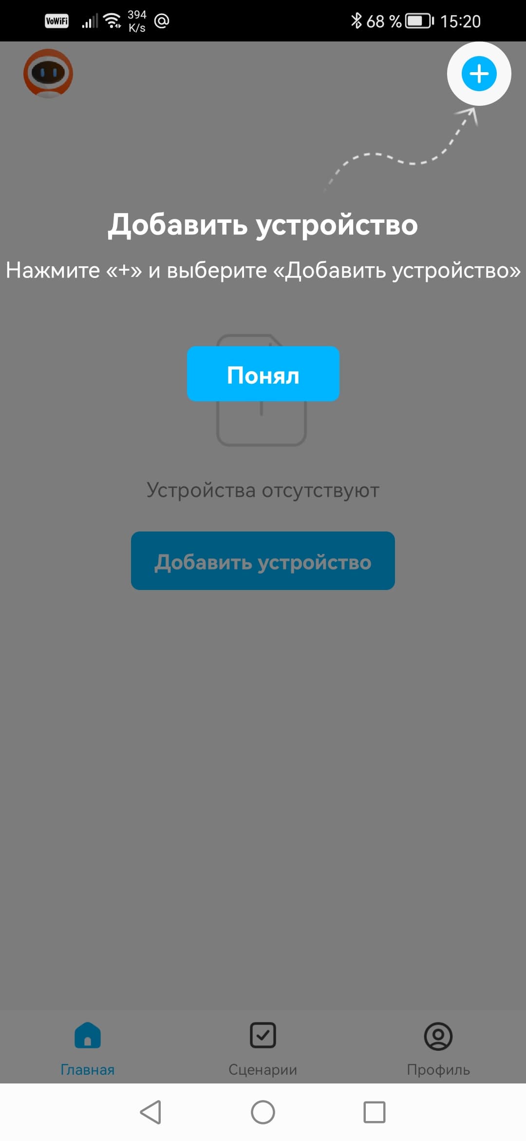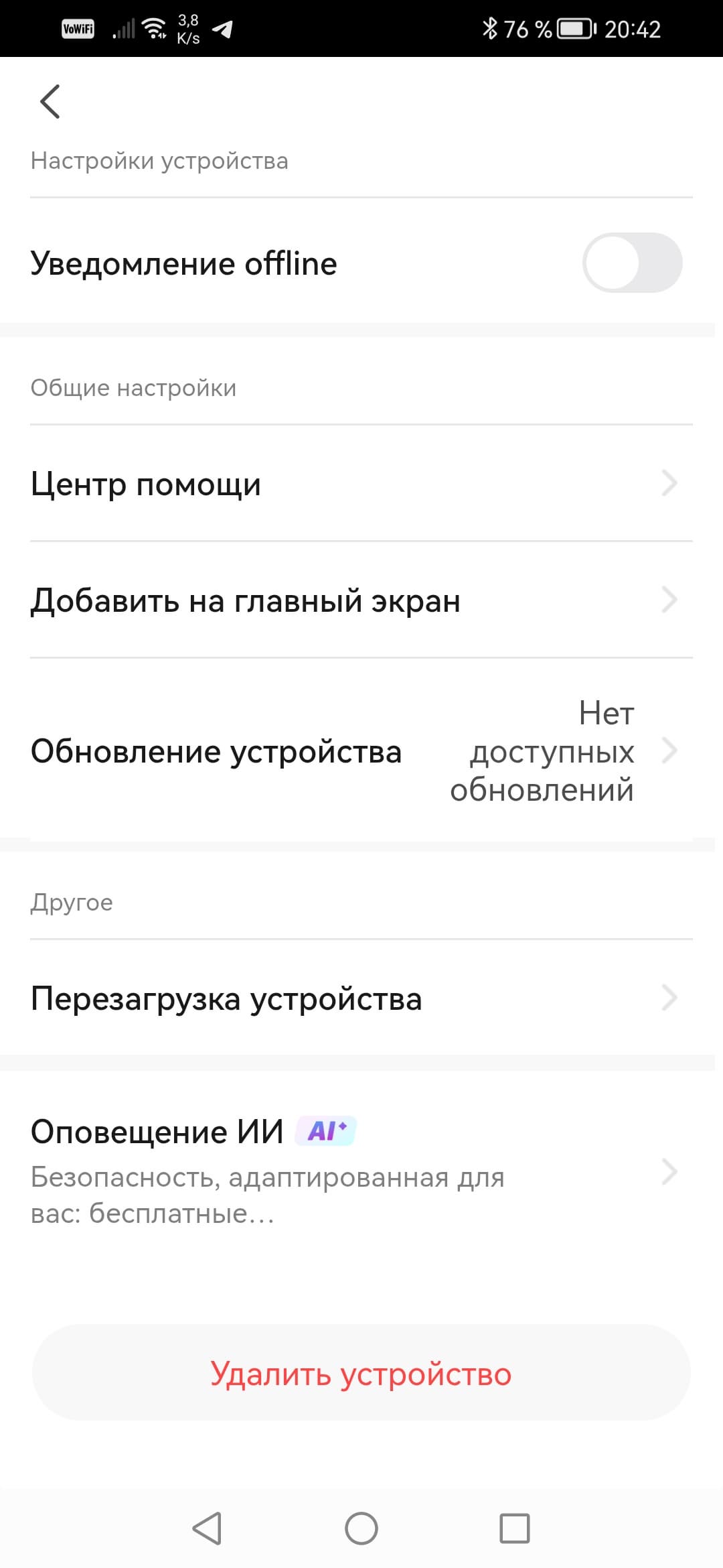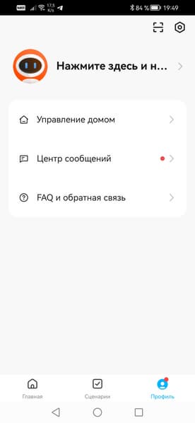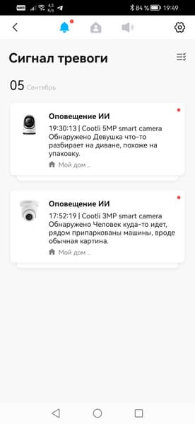 Подключенные устройства отображаются на главной страничке приложения. Помимо главной, здесь существуют ее две страницы: Сценарии и Профиль. О сценариях говорить рановато, поскольку в нашем виртуальном доме всего лишь две камеры, им просто не с чем взаимодействовать. А вот страничка Профиль интересна не только возможностью редактирования дома, но и наличием Центра сообщений. Только здесь, в этом центре, вы впоследствии сможете видеть полноформатные оповещения, содержащие стоп-кадр события и полное описание происходящего в кадре. На следующих скриншотах можно видеть необычные тексты, будто стоп-кадр комментировал остряк-самоучка. Так и есть. Это работает «ИИ». Ниже мы подробно расскажем о возможностях «искусственного интеллекта», который работает в рассматриваемых камерах.