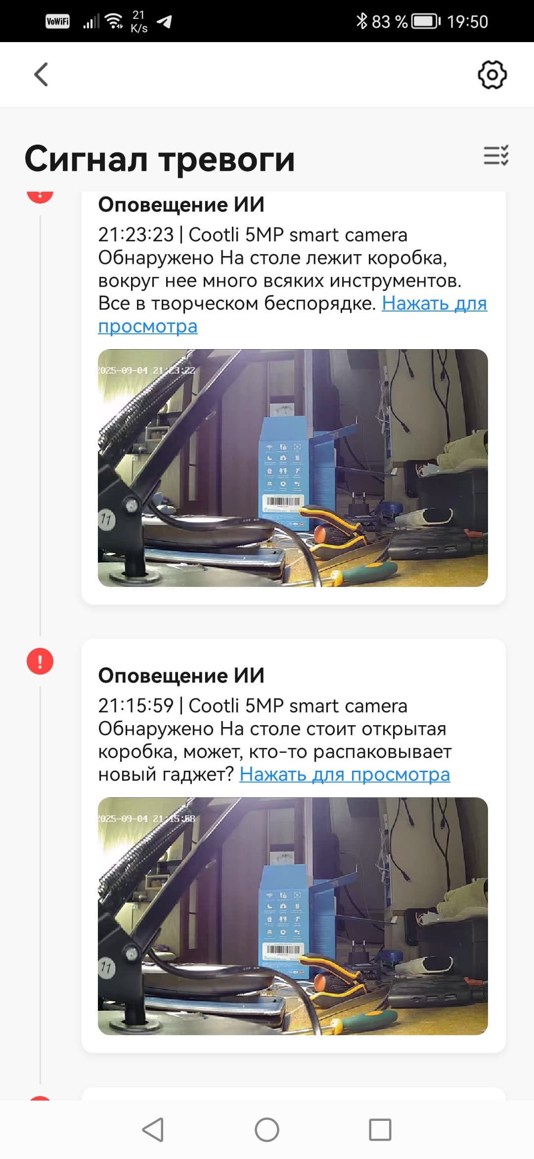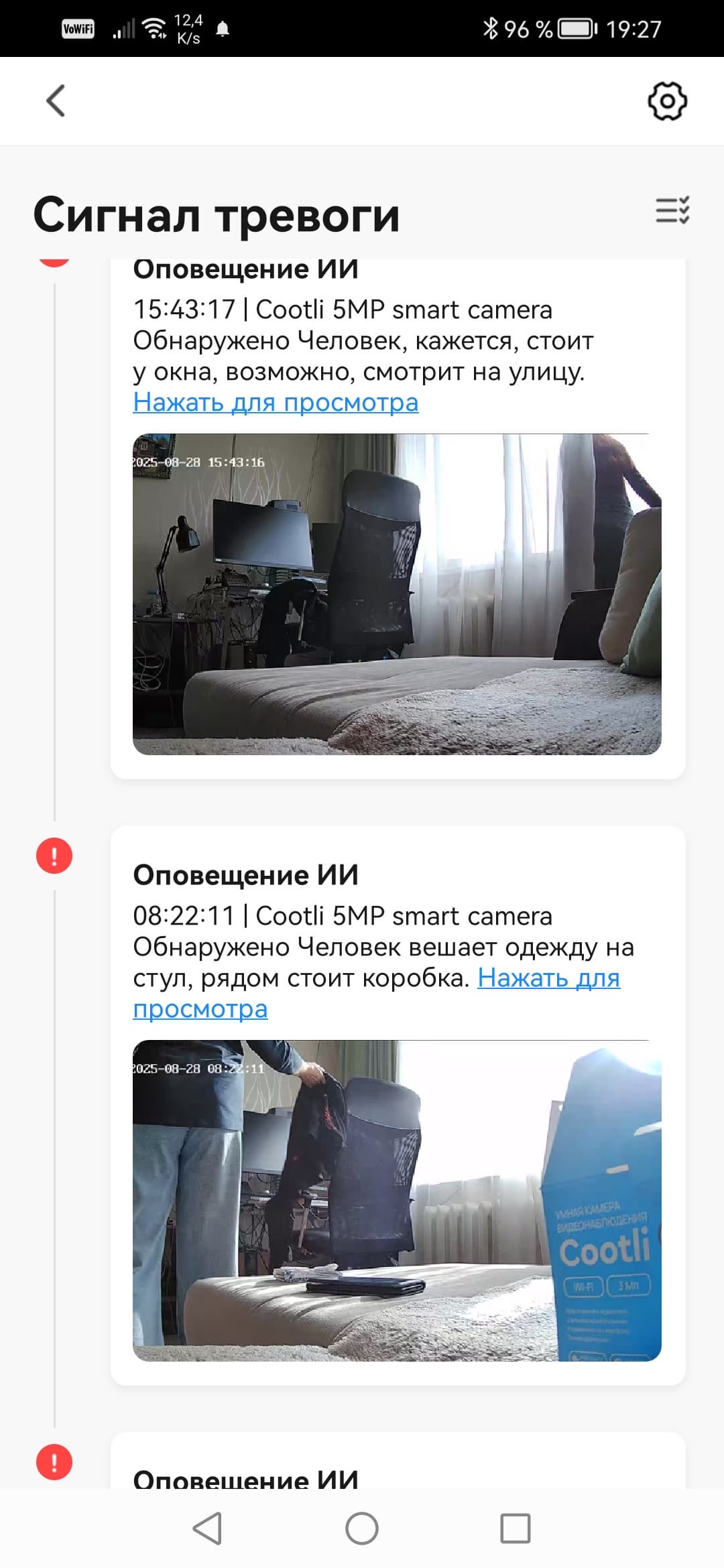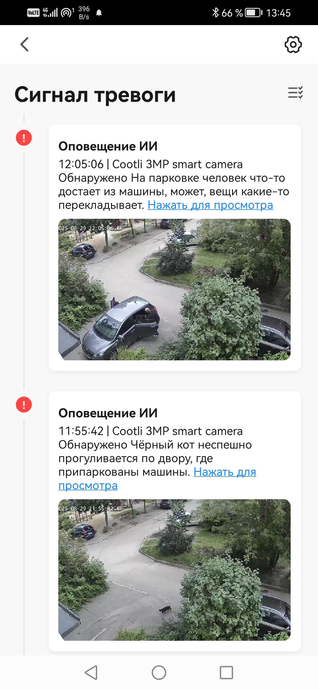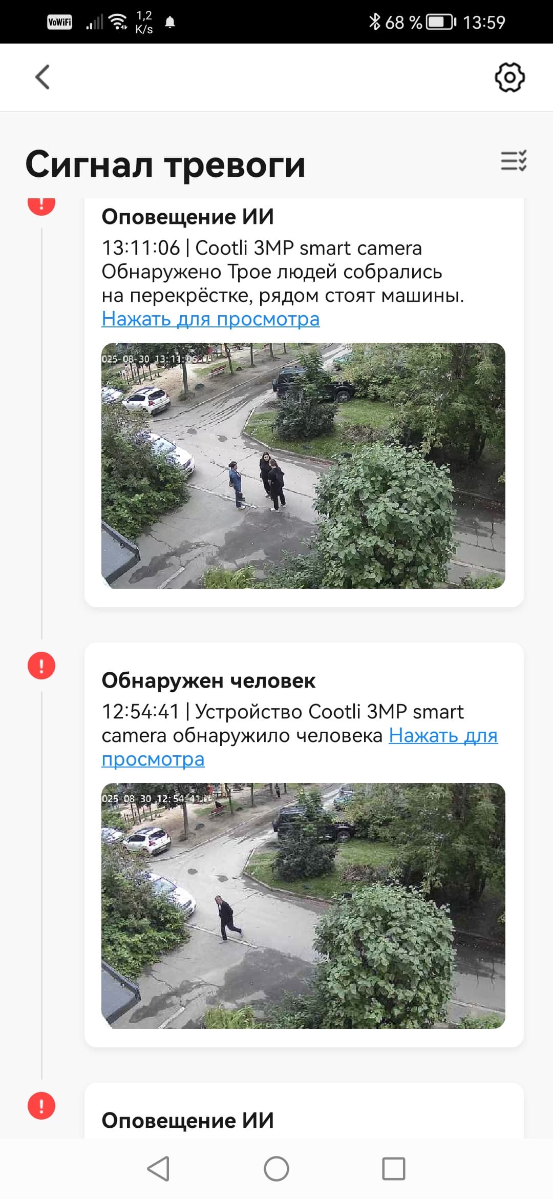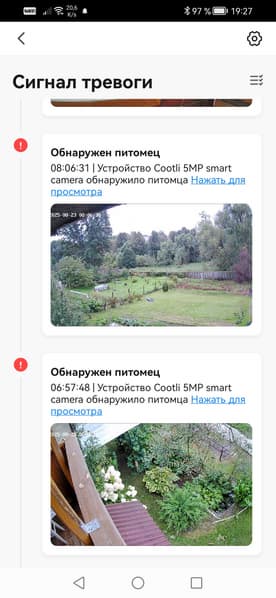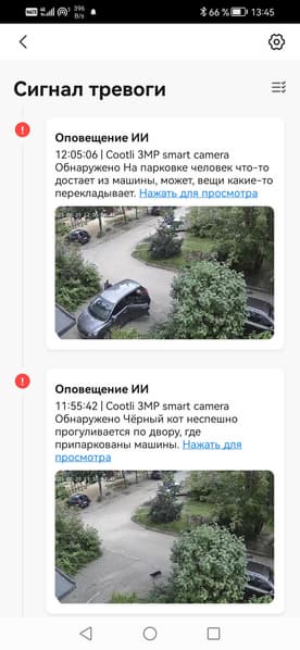 Помимо безликих Push-сообщений, камеры присылают уведомления и через собственное приложение. Эти уведомления уже снабжаются стоп-кадрами событий, а при нажатии на ссылку происходит переход на таймлинию архива.