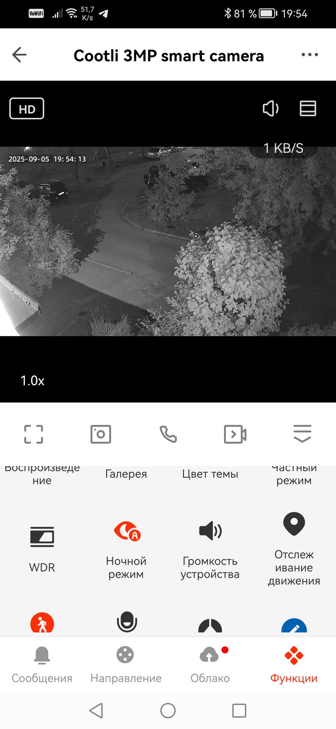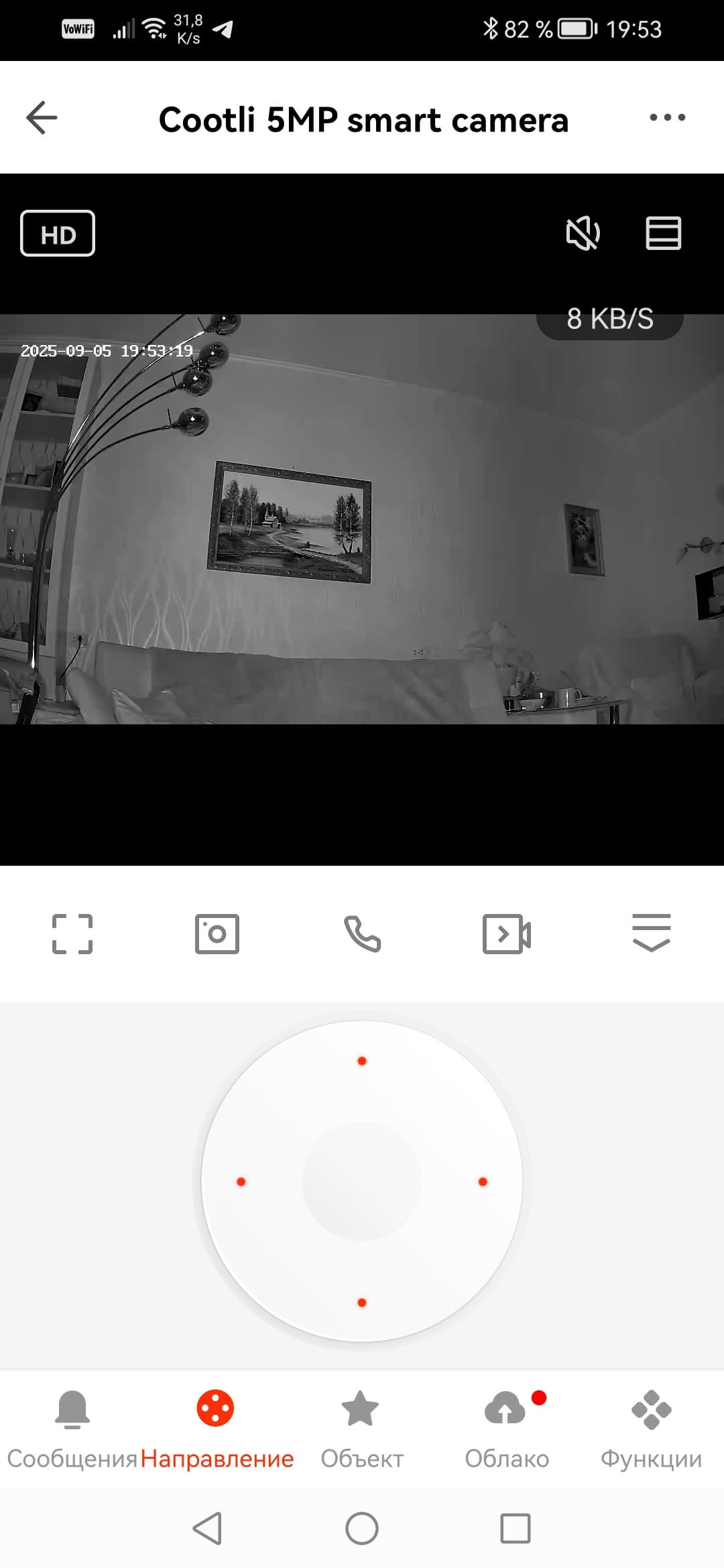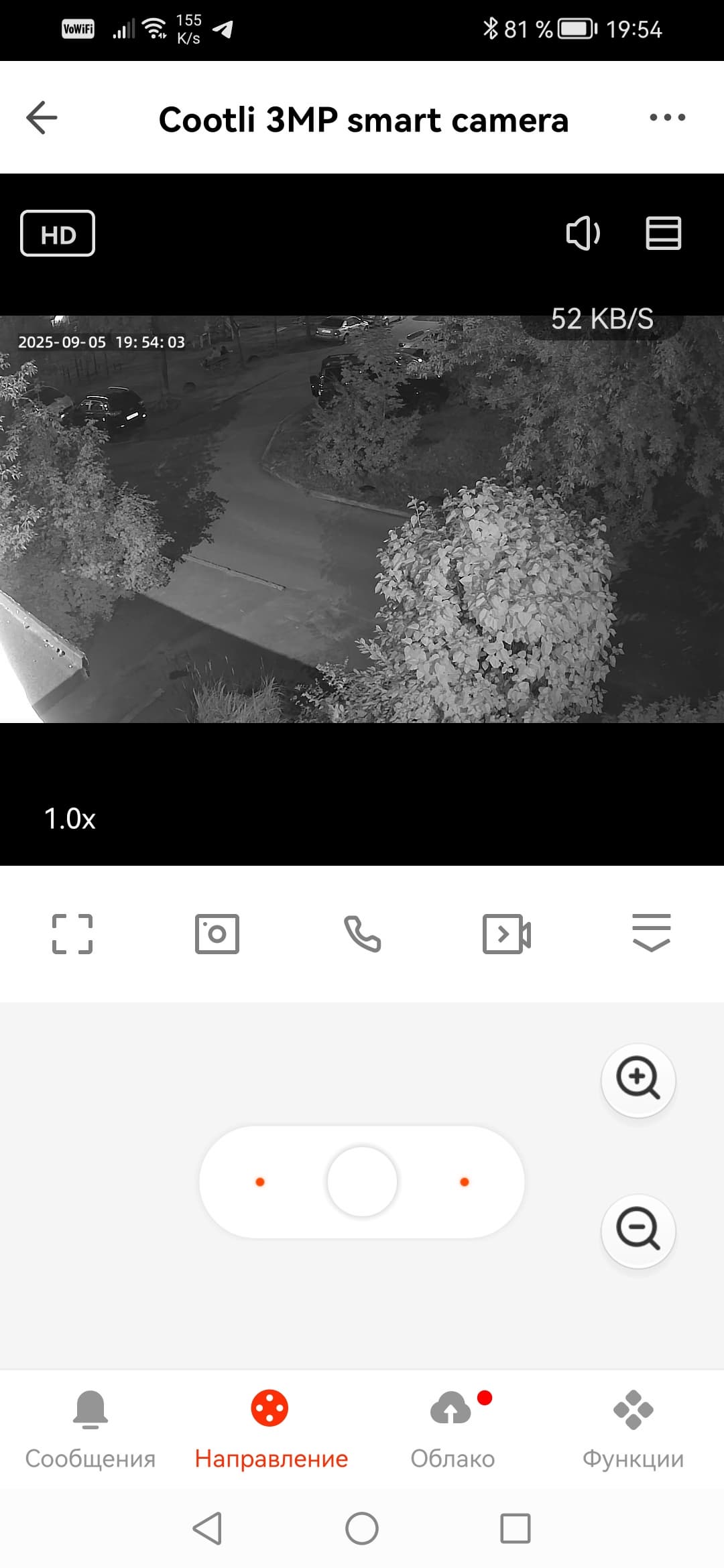 Пара манипуляций — и аппарат успешно работает в составе домашнего комплекса видеонаблюдения в качестве восьмой камеры. При этом поддерживаются такие функции, как детекция движения и управление приводом, меняющим положение аппарата.