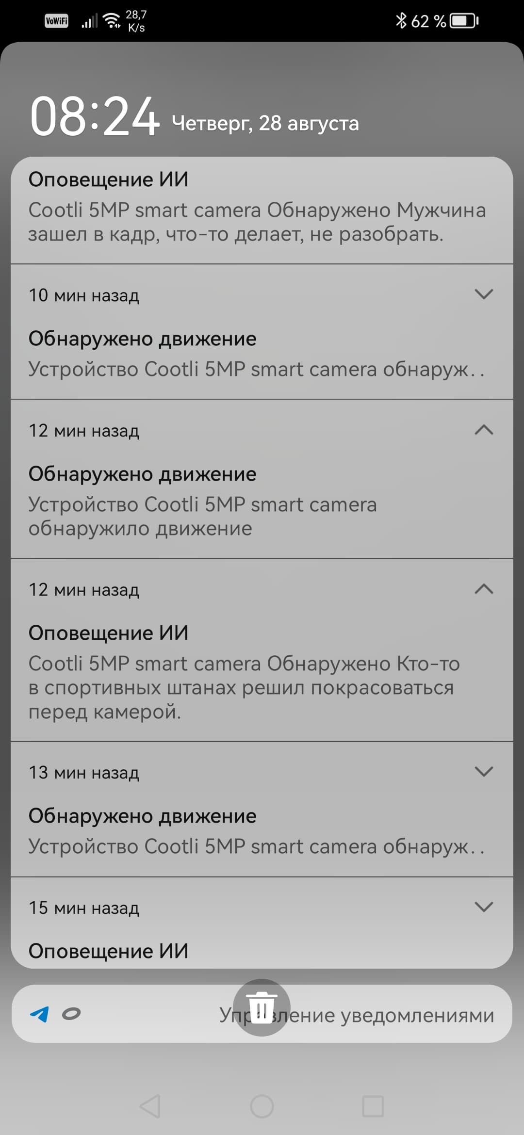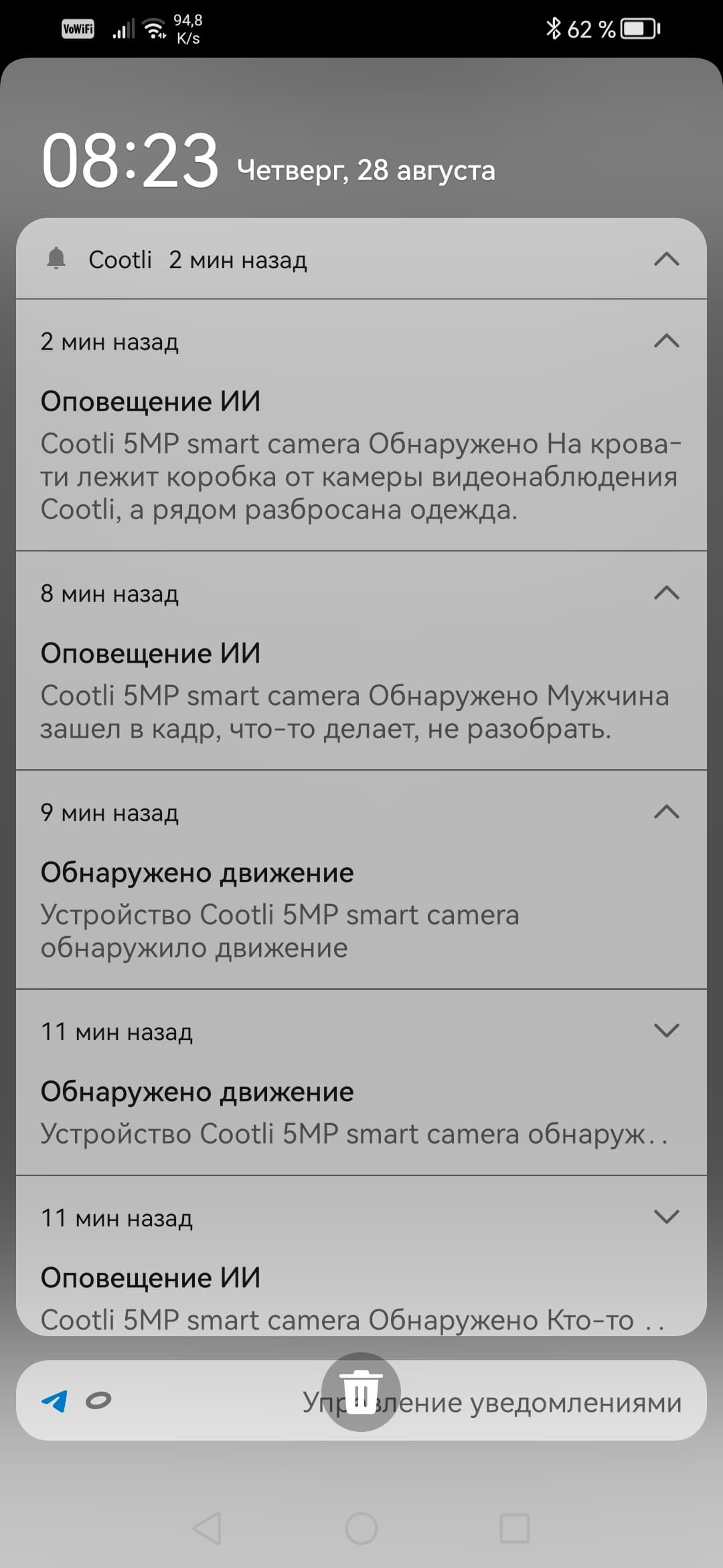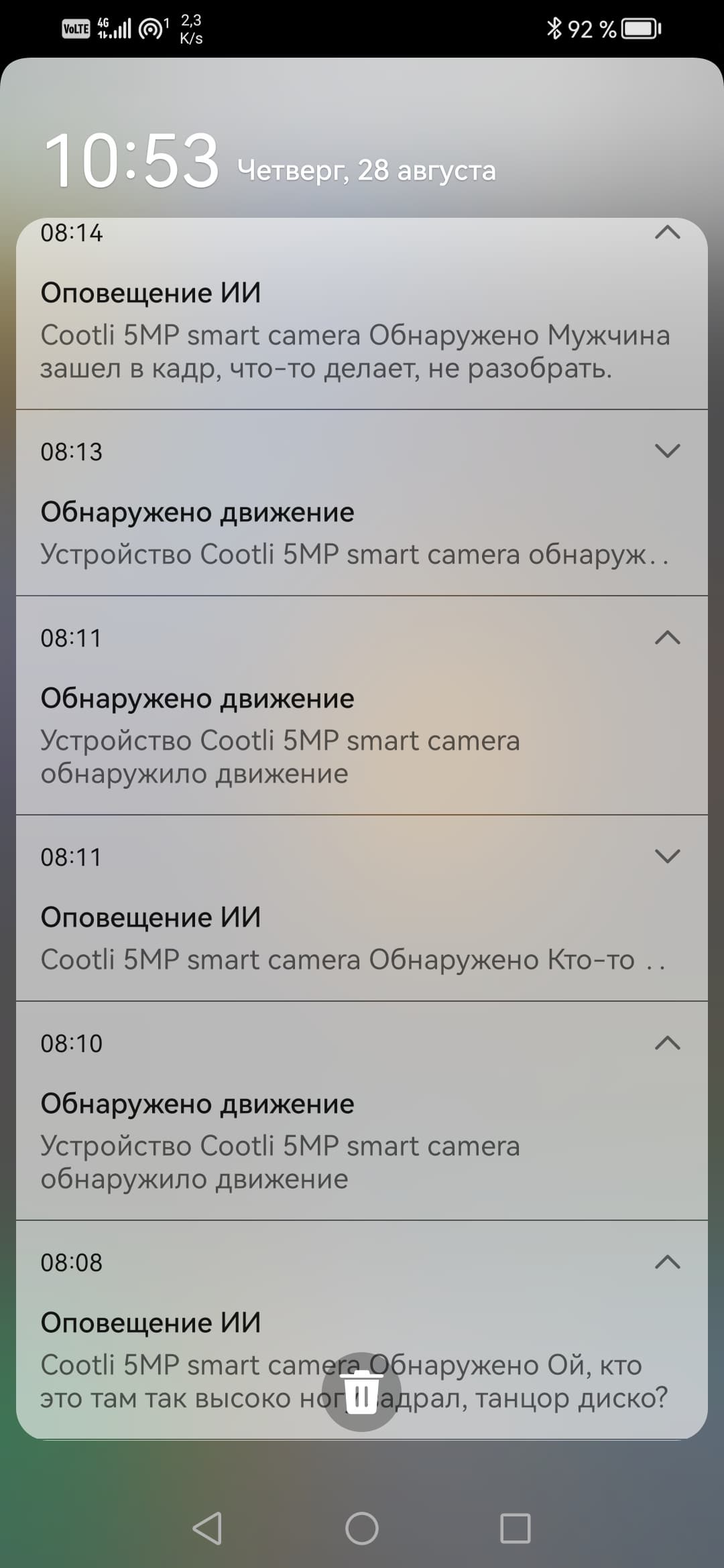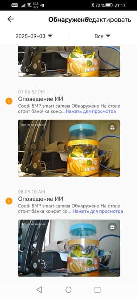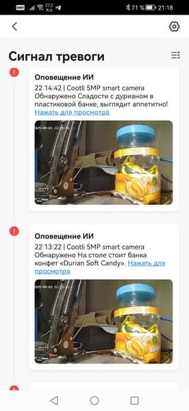 Несмотря на недообученность интеллекта, обе наши камеры чаще всего дают совершенно точное определение тому, что видят. Первые же поступившие на смартфон оповещения искренне обескуражили. Например, комнатная камера оповестила, что видит в кадре банку дуриановых конфет, и даже назвала производителя!