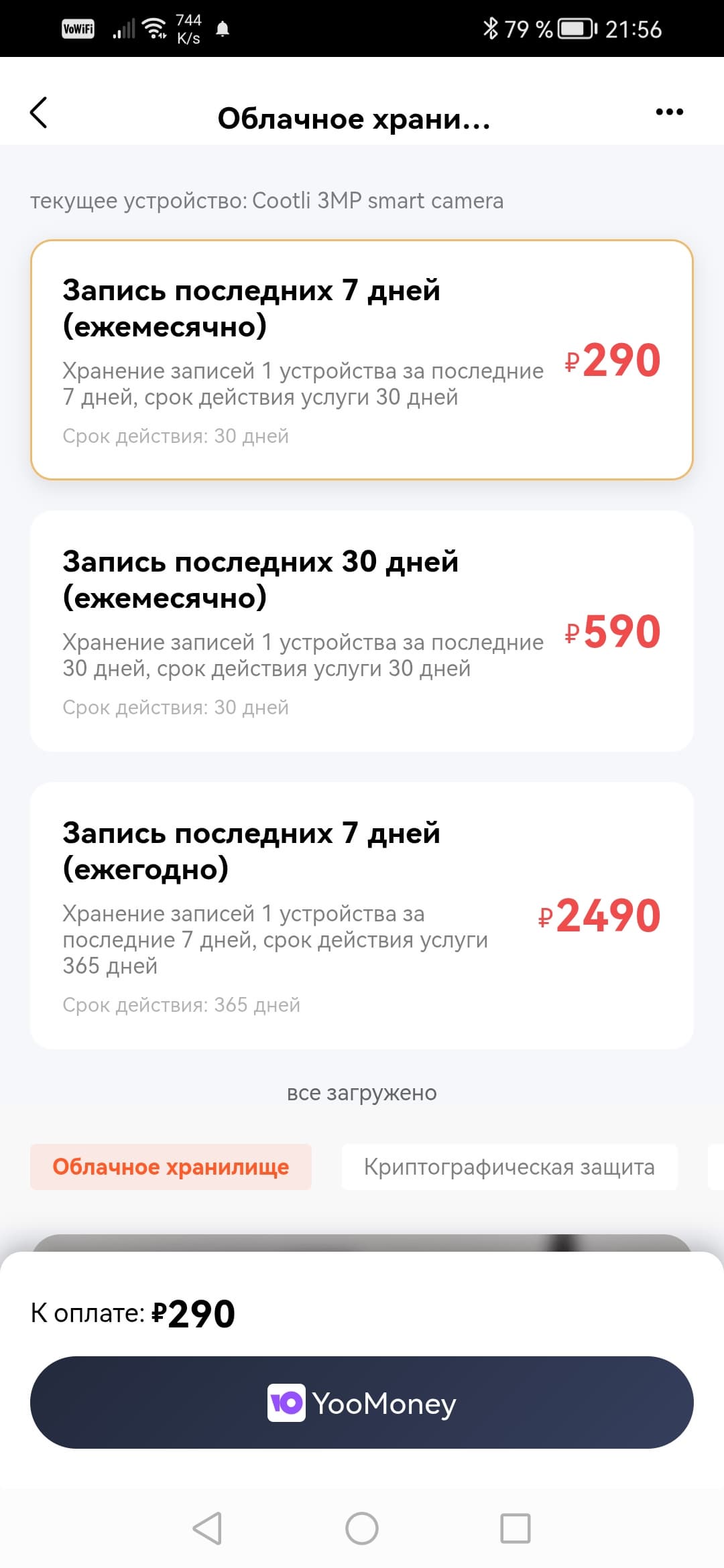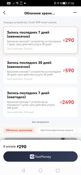 Покончив с настройками, поговорим о деньгах. Точнее, о тарифных планах. Можно видеть, что все три предложения «крутятся» вокруг единственной функции — запись видео в облако. Здесь доступны два варианта: 7-дневный и 30-дневный архив, с соответствующей разницей в цене подписки.