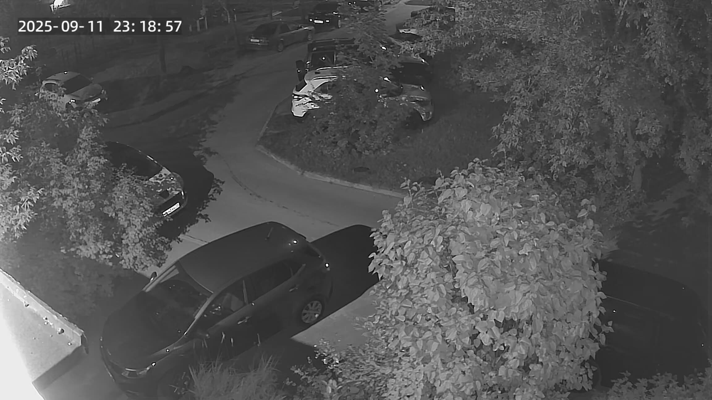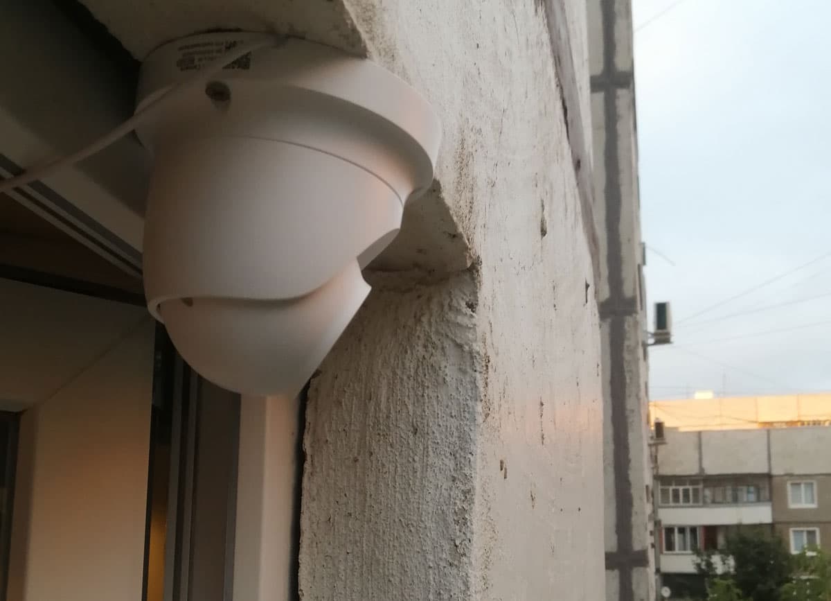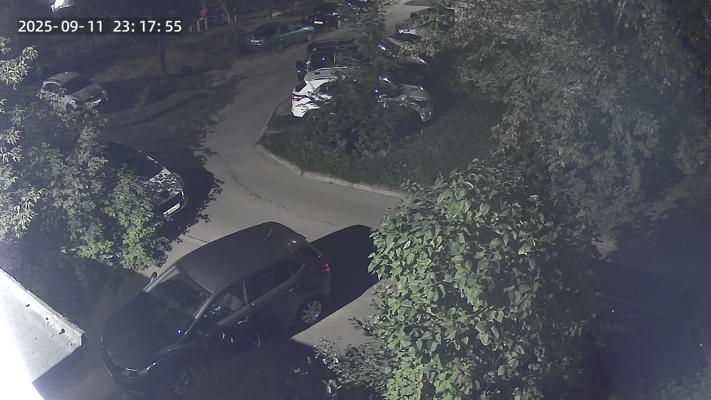 К счастью, эту подсветку можно отключить в настройках камеры, переведя ее в ночной режим с инфракрасной подсветкой. Кстати, на следующих кадрах можно оценить высокую чувствительность сенсора камеры: слабых приподъездных фонариков камере вполне хватает для получения различимой цветной картинки. При этом белый прожектор уже не так сильно влияет на качество, засветка тут видна лишь по бокам кадра.