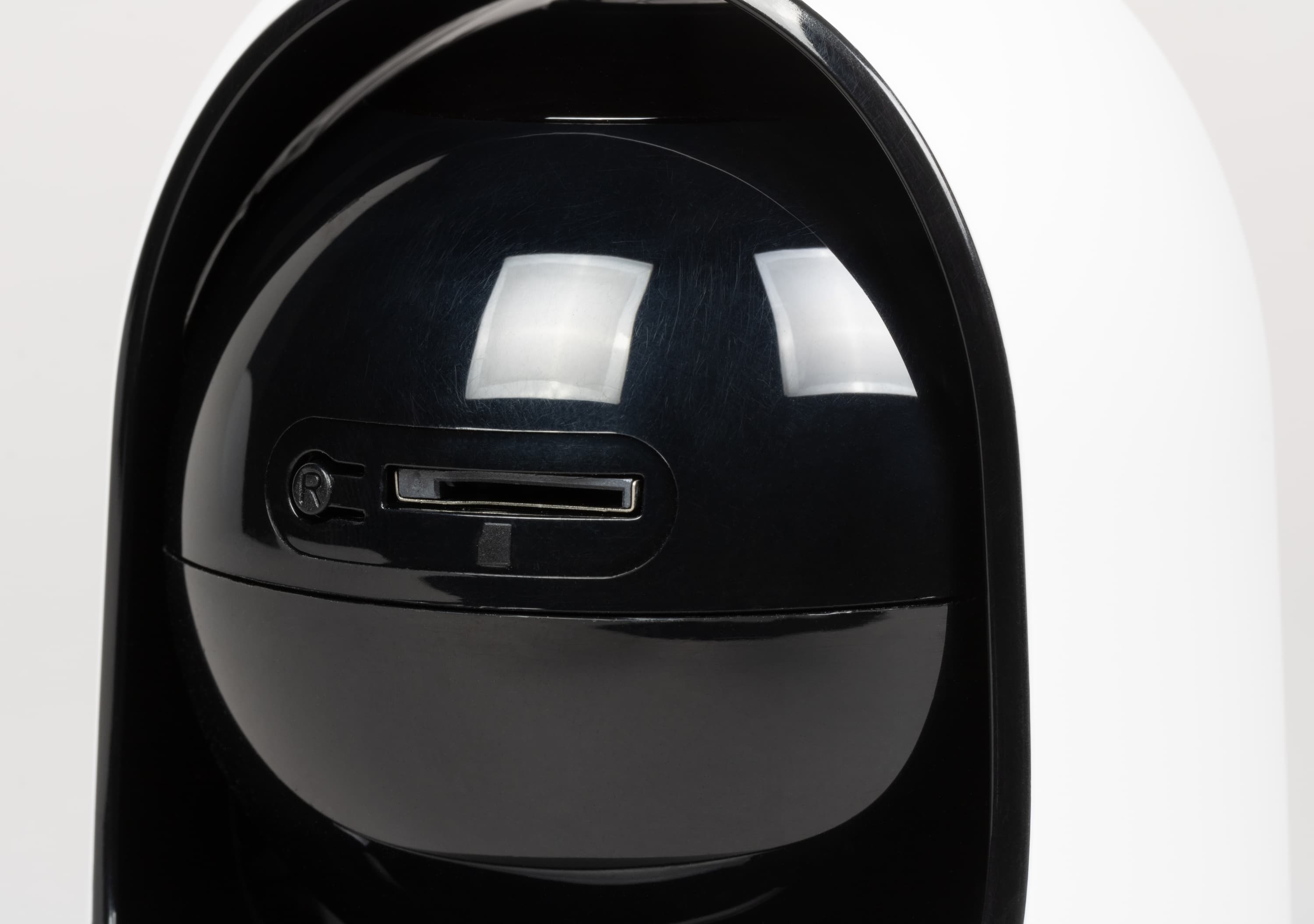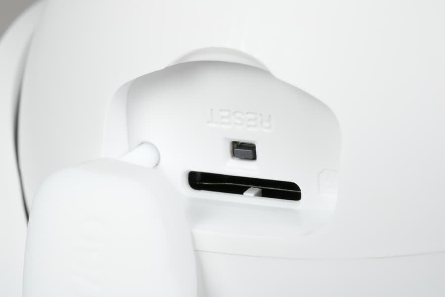 Слот для карты памяти и кнопка сброса у обеих камер находятся в их шаровых блоках, в уличной версии камеры слот защищен белой резиновой заглушкой.