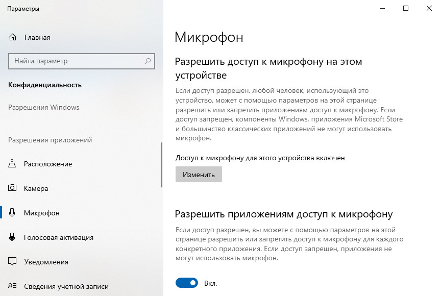 Программа во время первого запуска напомнила о необходимости зайти в параметры конфиденциальности Windows 10 и включить поддержку камеры и микрофона.