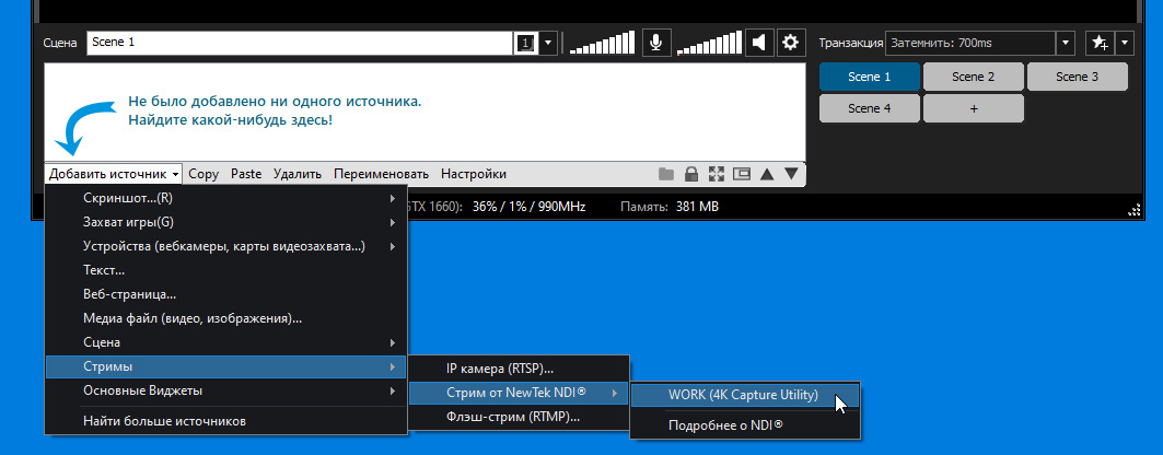 Теперь это приложение можно свернуть в панель задач и запустить XSplit (кстати, для работы Stream Link в XSplit и OBS нужно установить дополнение OBS NDI). В XSplit источники собраны в одном выпадающем меню, здесь нужно отыскать NDI с именем компьютера, в нашем случае это WORK (4K Capture Utility).