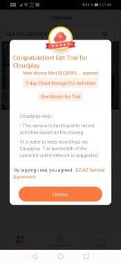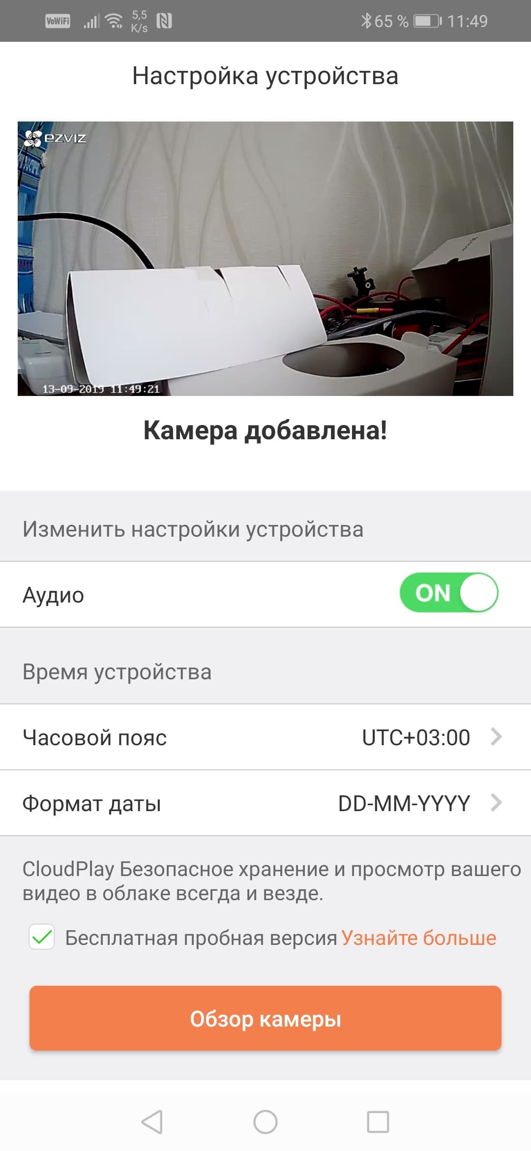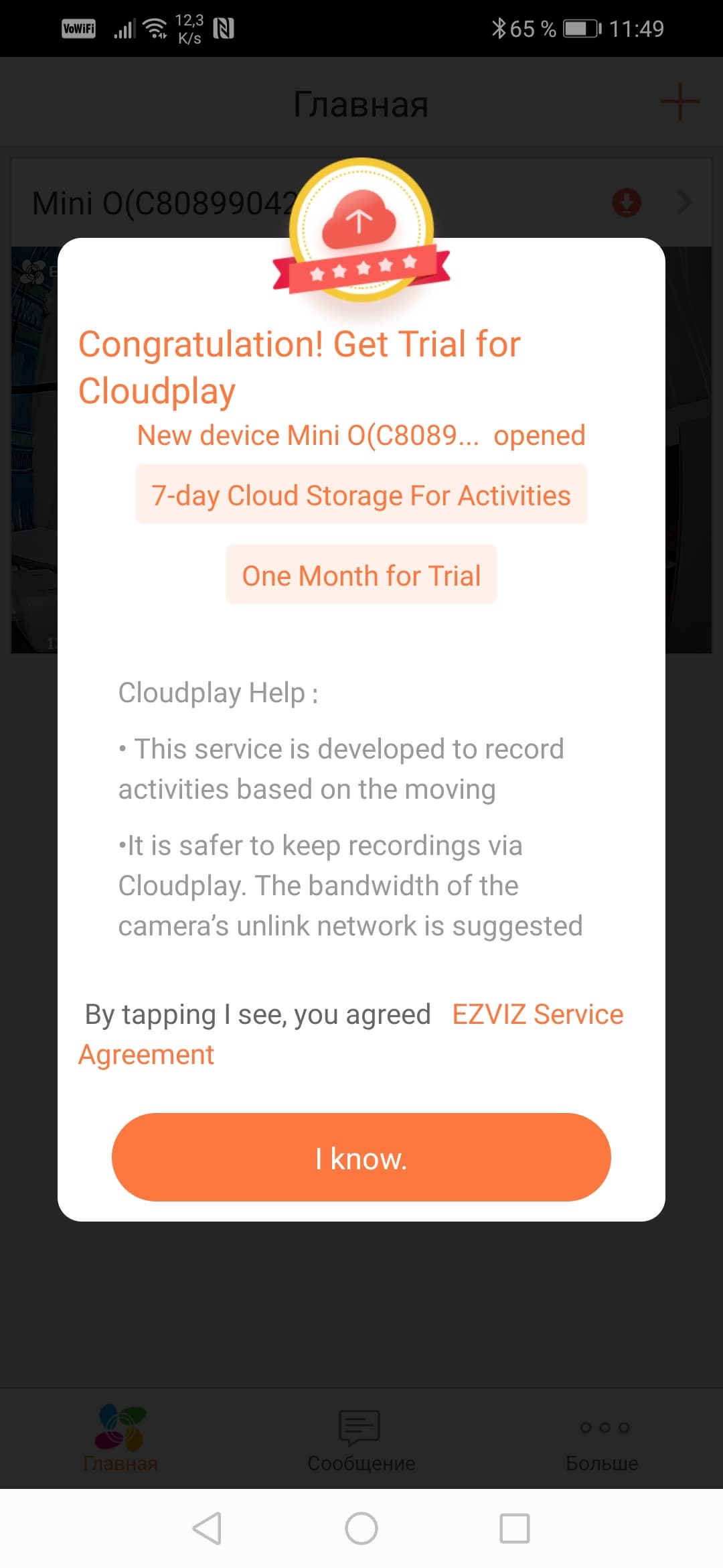Следующие шаги в принципе необязательны, поскольку камера уже работает, прямая видеотрансляция через облачный сервис Ezviz стартует немедленно по окончании инициализации камеры. Но эти шаги важны для определения способа записи и хранения архива. Так, Ezviz предлагает семидневное хранение архива на своих серверах с месячным бесплатным пробным периодом. В процессе тестирования камеры автор удалил из учетной записи это устройство, тут же подключив его снова — но увы, trial-период оказался уже недоступен. По всей видимости, пробный месяц дается не устройству, а учетной записи, аккаунту. Таким образом, если у вас имеется не одна, а две камеры или больше, то бесплатный месяц архивирования будет доступен только для одного устройства.