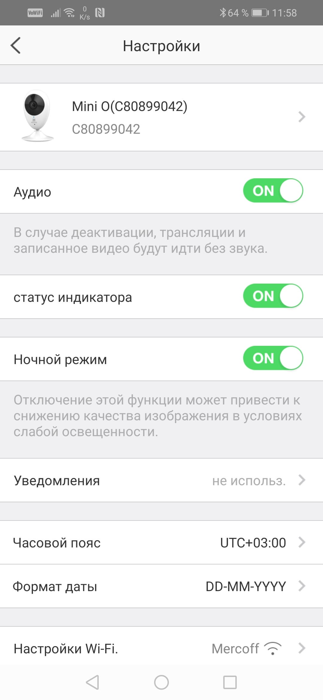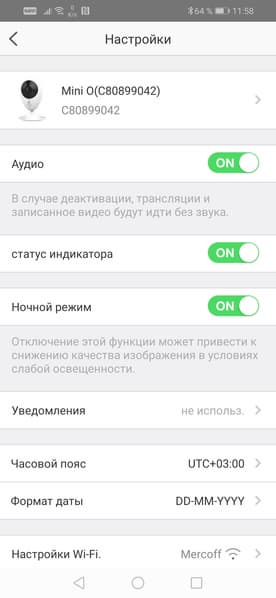 Несмотря на явную любительскую направленность IP-камеры, присутствующие в мобильном приложении настройки нельзя назвать скромными. Они охватывают все основные функции устройства. Но есть исключение — это сетевые настройки. Камеру нельзя заставить работать по каким-либо протоколам, кроме закрытого фирменного Ezviz. Также нет возможности задать IP-адрес вручную — камера всегда получает его только от маршрутизатора (Wi-Fi-повторителя, коммутатора). Единственная возможность «поковыряться» с сетевыми параметрами — это способ изменить Wi-Fi-сеть. Это понадобится, когда камеру переместили в другое место, в другую Wi-Fi-сеть.