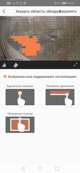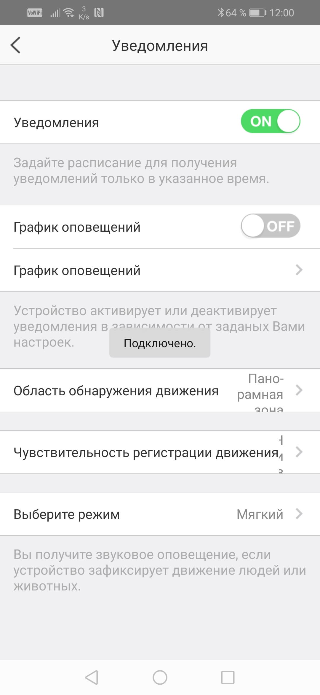 Здесь же присутствуют пункты, переход по которым ведет к в отдельные страницы настроек. Например, пункт Уведомления раскрывает дополнительное меню, где настраивается общее поведение системы, пальцем рисуется зона детектирования движения, выбирается чувствительность детектора, активируются звуковые сигналы динамика камеры, сопровождающие событие.