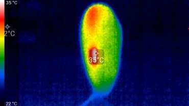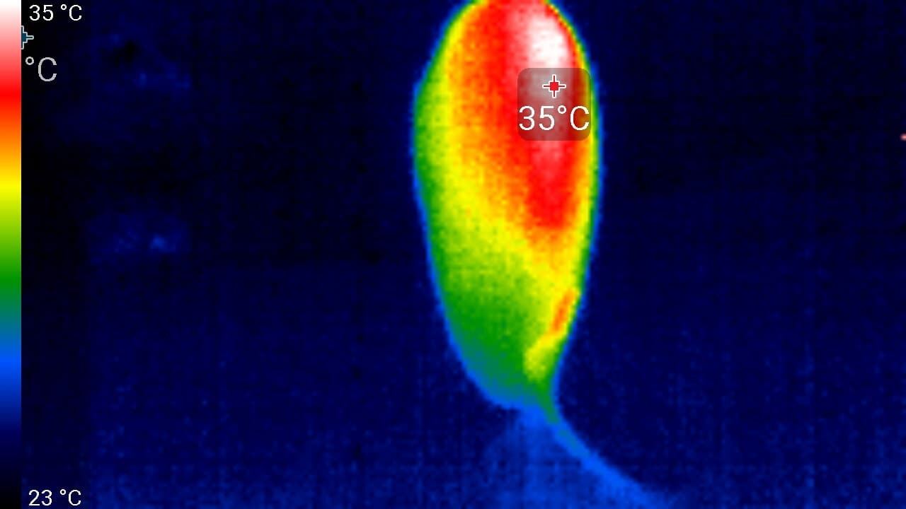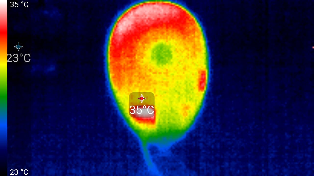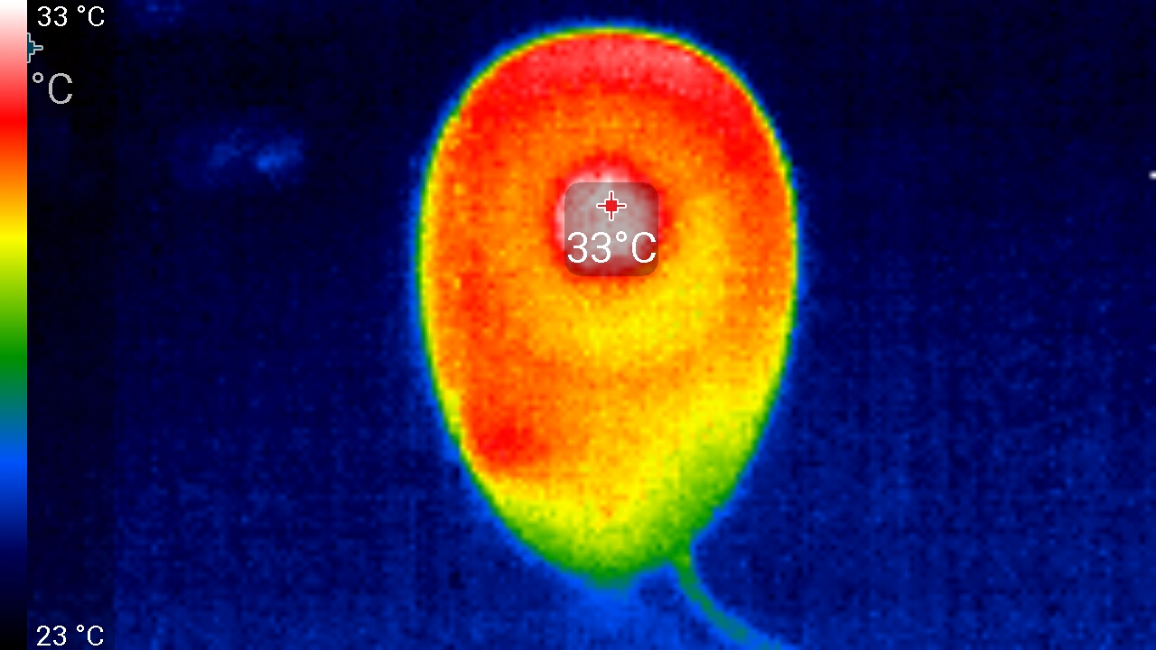Наконец, коснемся немаловажного аспекта: нагрева устройства. Чем современная электроника — тем больше тепла отдают ее компоненты. Но это не относится к рассматриваемой камере. Скромный датчик и процессор отличаются низким энергопотреблением. А значит, устройство почти не нагревается. Следующие тепловизионные снимки сделаны после нескольких часов работы камеры в помещении с температурой около 23 °C. Можно видеть, что лишь отдельные участки корпуса нагрелись до 35 °C, что совершенно не опасно для устройства.