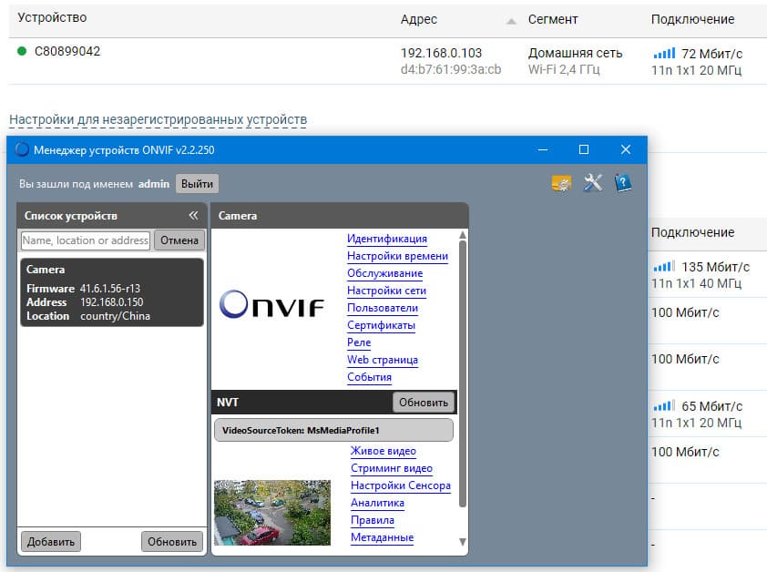 Как мы уже отмечали, камера может работать только с фирменным проприетарным протоколом. Иные способы получить с нее изображение, кроме как через облачное или прямое шифрованное подключение, отсутствуют. Соответственно, камера ничем и никак не выдает своей работы: программа ONVIF Device Manager не видит наше устройство, которое, тем не менее, в данный момент успешно трудится в локальной сети под адресом 192.160.0.103, будучи подключенной со скоростью 72 Мбит/с (на заднем плане — скриншот состояния сетевых устройств на страничке маршрутизатора).