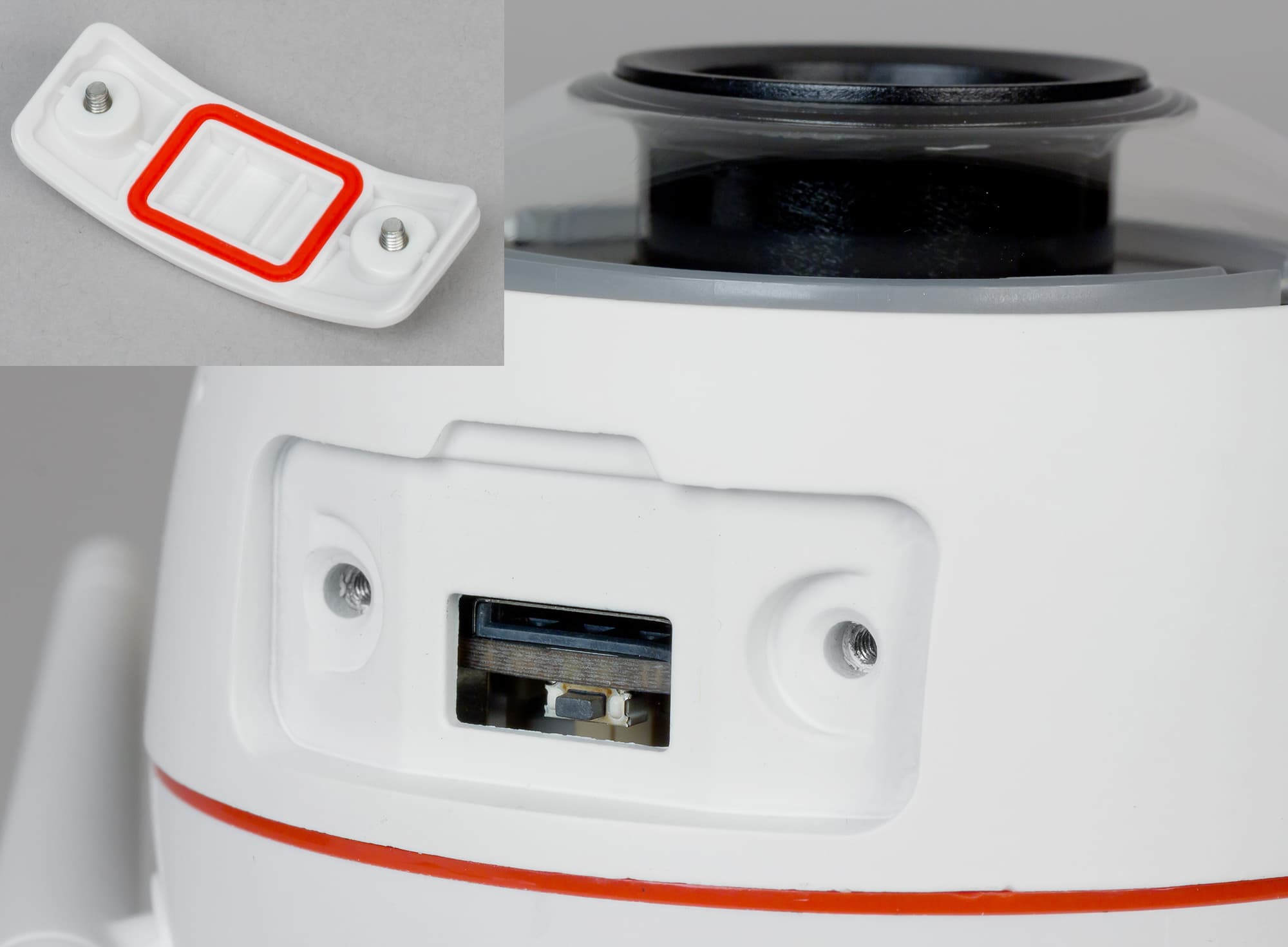 Также в нижней части блока камеры расположена съемная крышка, зафиксированная двумя болтами. Под этой крышкой находится слот для карты памяти формата micro SD/SDHC/SDXC и кнопка, десятисекундное удерживание которой приведет к сбросу камеры на заводские настройки. Крышка оснащена силиконовой прокладкой, предохраняющей внутренние интерфейсы от атмосферных воздействий.
