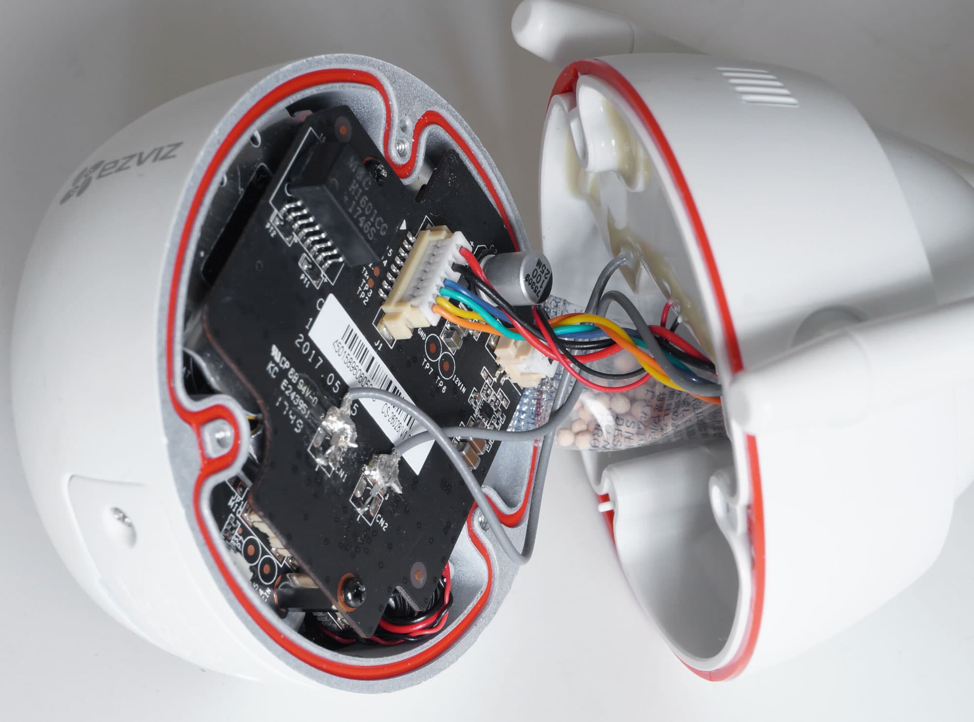 Такая же силиконовая защита имеется и по всему периметру двух половин корпуса. Также признаки защиты можно наблюдать и во внутреннем убранстве камеры, где каналы, по которым проложены провода, обильно залиты герметиком.